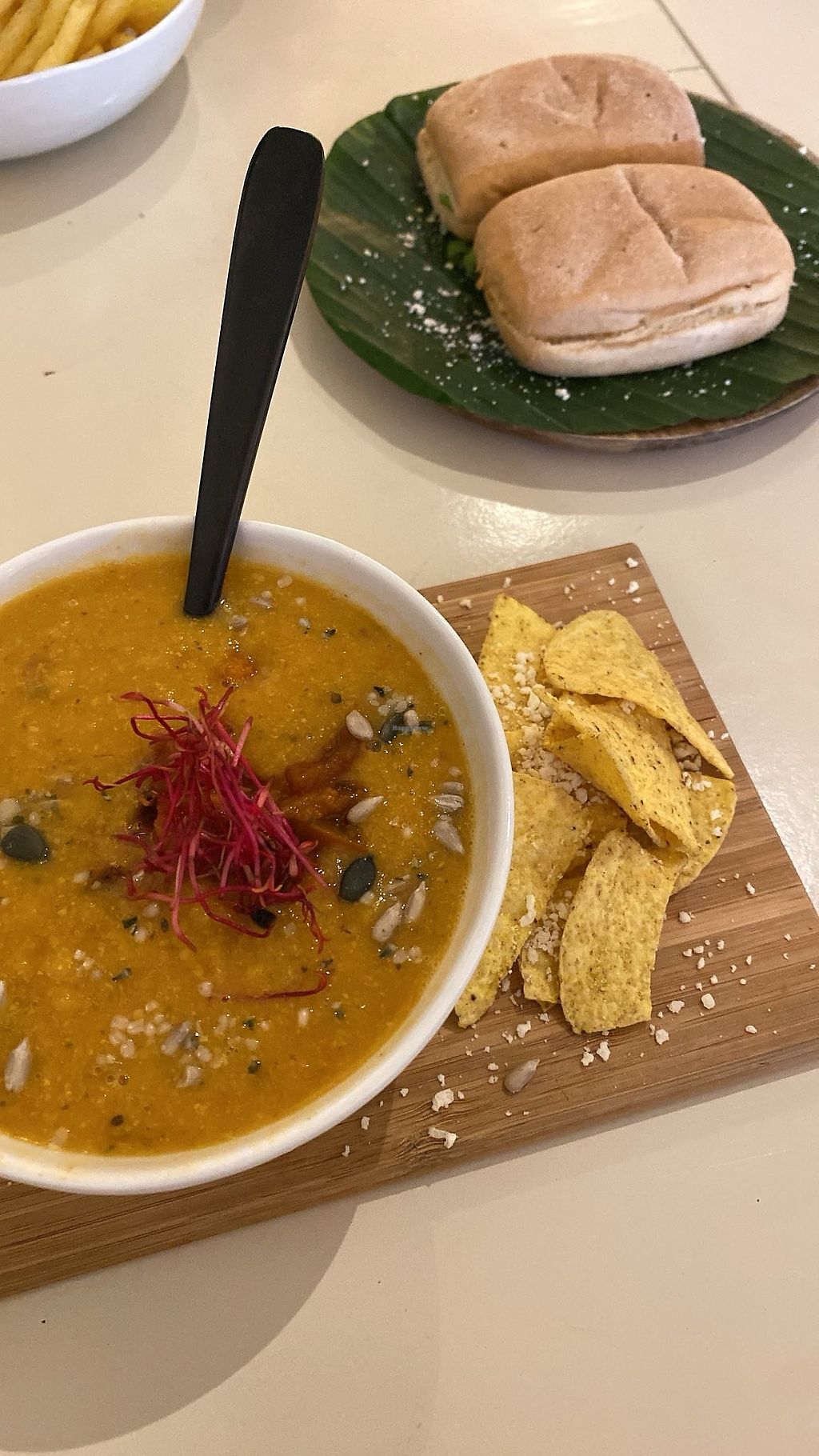 Diversiteit aan type gerechten met smaakvolle huisgemaakte producten. Zoals de bonenburger waarvan het broodje van gebakken banaan ook zelf is gemaakt. Meerdere gerechten zijn creatief bereid met lekkere smaakcombinaties vol specerijen. Ohja, ook nog eens betaalbaar!