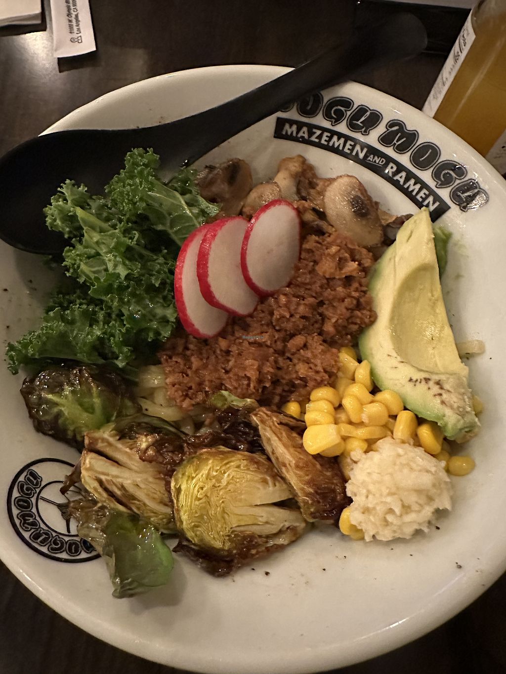 The vegan mazemen they have here is delicious and flavorful. The noodles have a great chew to them. The Brussels sprouts are cooked perfectly. I love how they give you a small portion of rice to mix with all the leftover sauce.