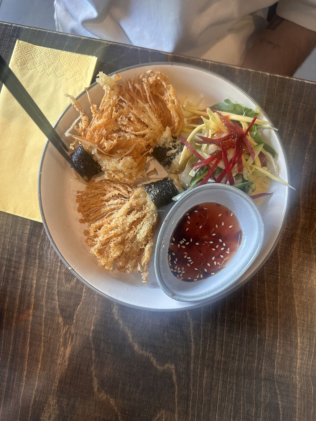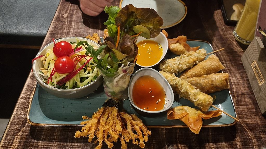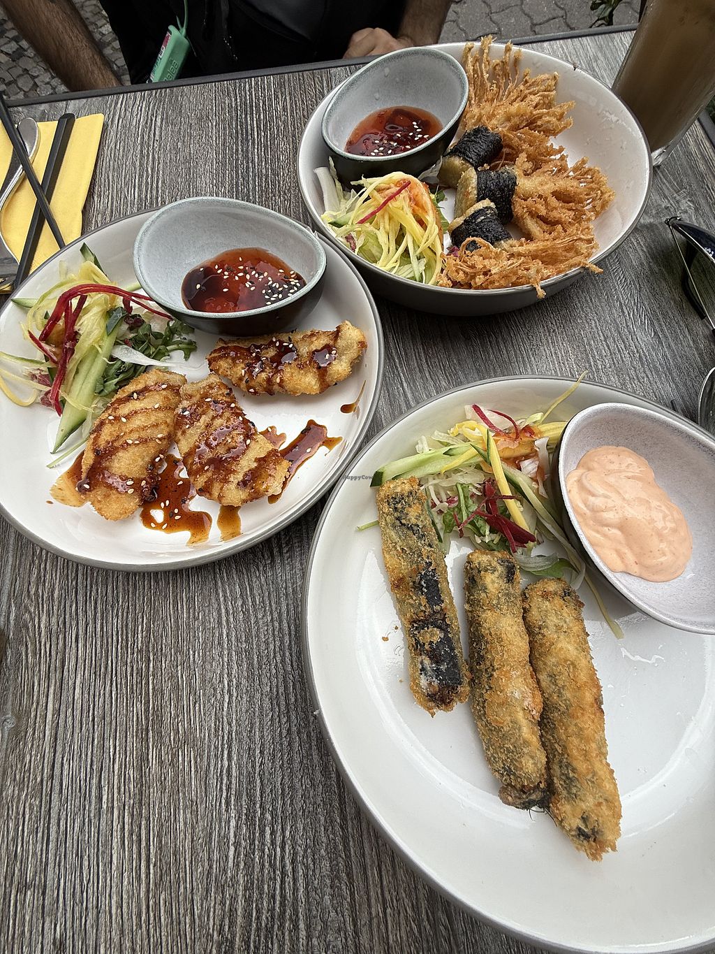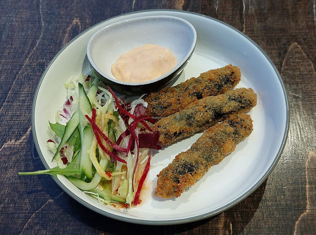 Vorspeisen: veganer Backfisch, panierte Enoki und paniertes, veganes H…