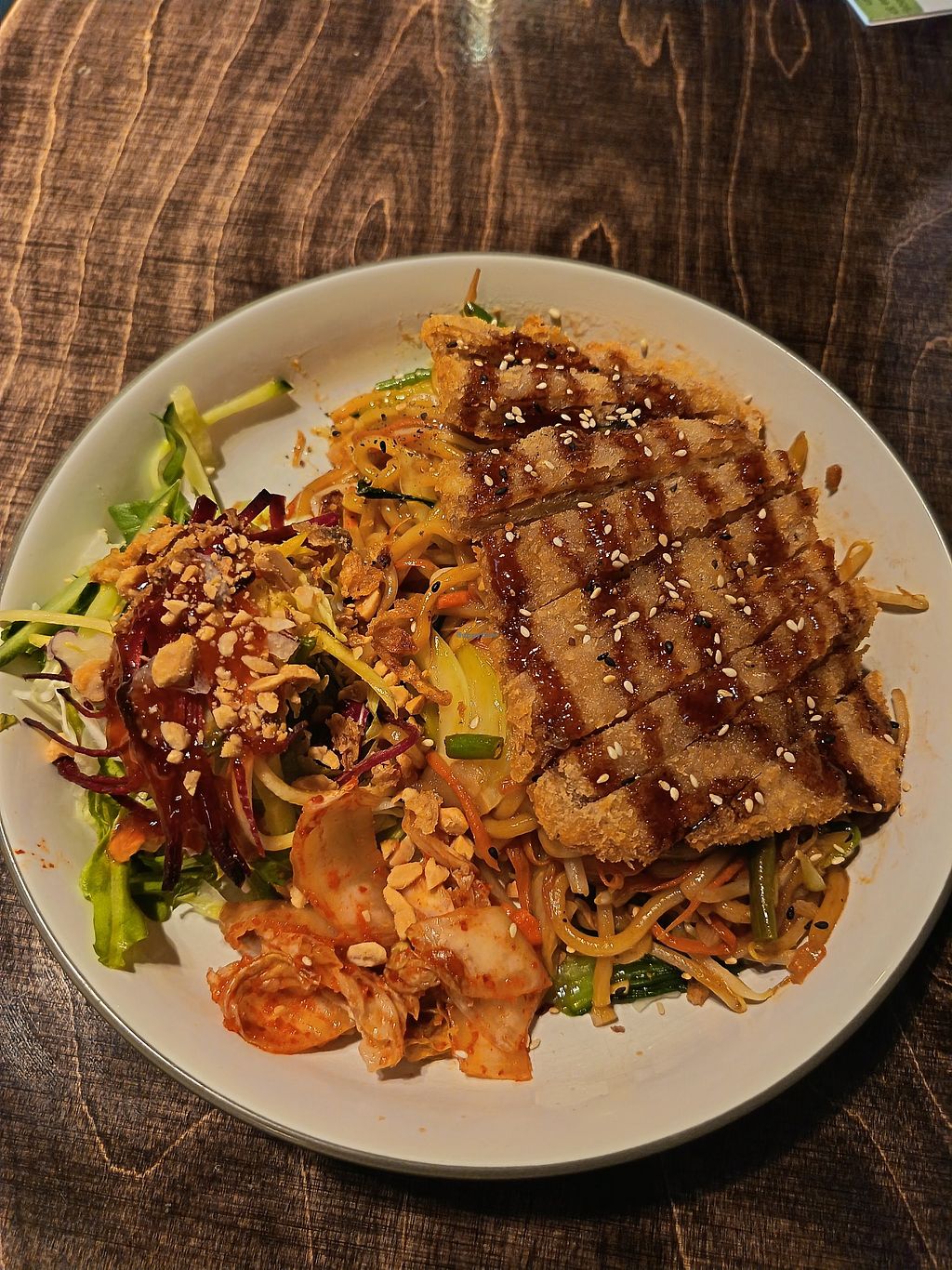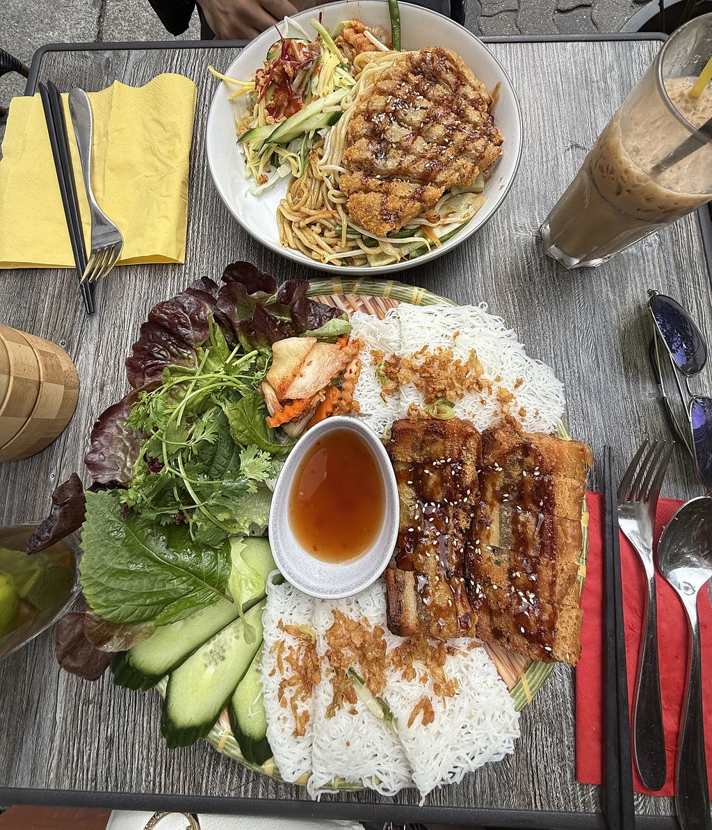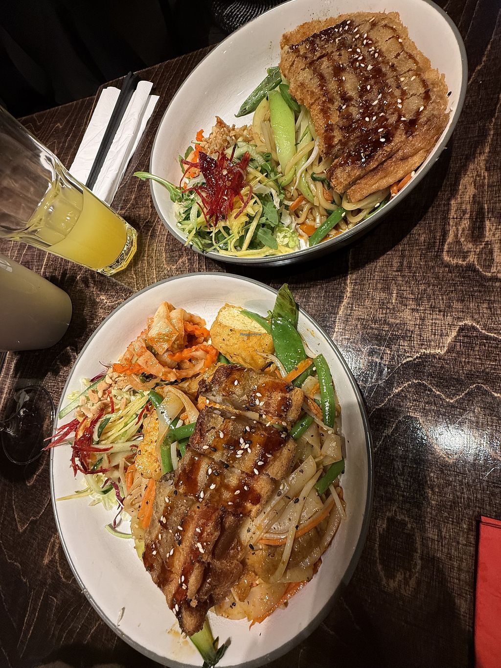 Hauptspeisen: vegane Ente auf Nudeln und der köstliche, vegane Schwein…