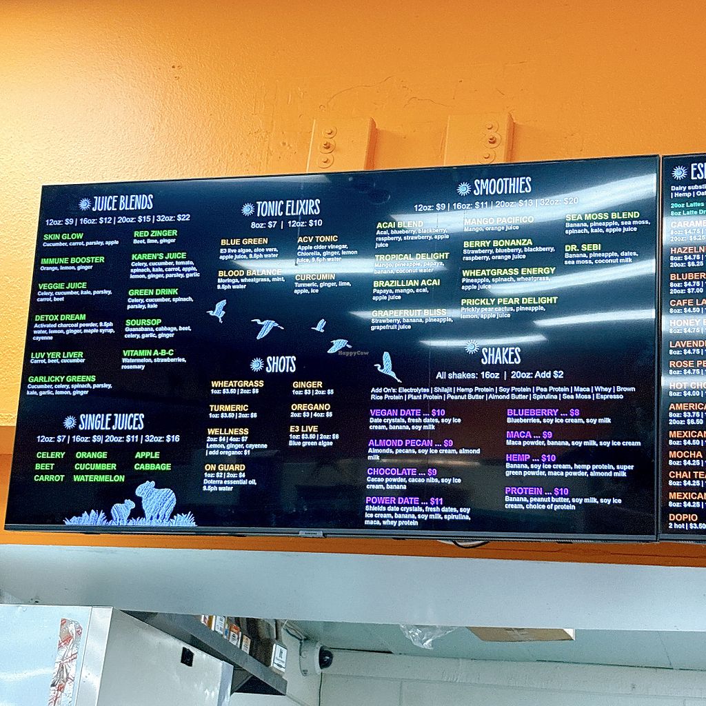 Smoothies, Juice, wraps, bowls, etc. lots of options. Does have dairy and eggs but easy to identify. Vegan friendly. Great stop!
