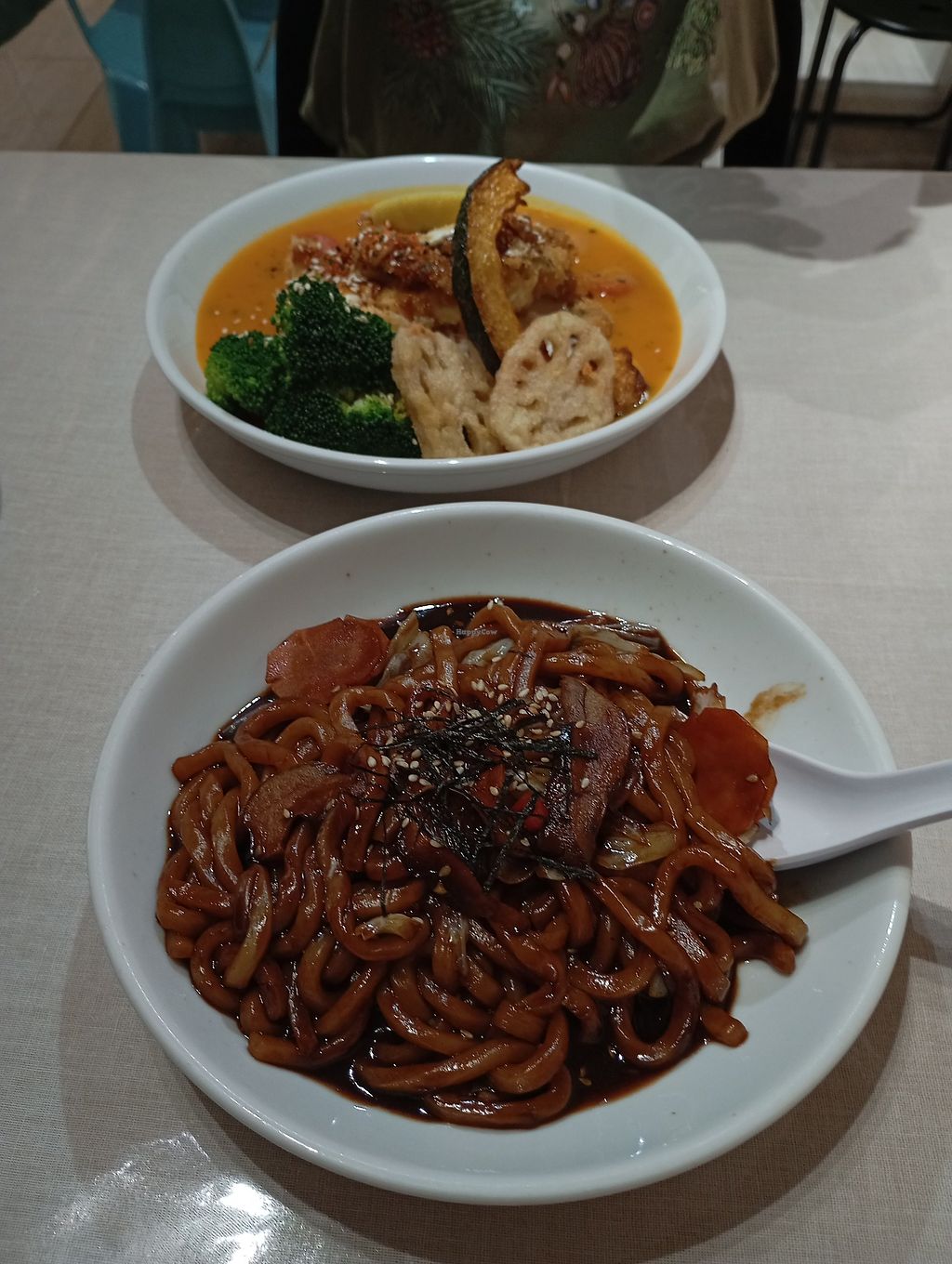 Delicious vegan food in a very comfy and friendly space ❤️ we got fried udon noodles and spicy curry rice. Menu is quite small but has everything you need, also affordable. The lemon drink was so good 😋 Owner is super nice and welcoming!