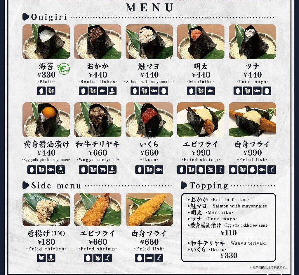 Ovo Japanese Fast food Take-out Gluten-free Non-veg Serves meat, vegan options available. Onigiri bar with vegan onigiri (plain rice with seaweed & salt). Open Mon-Sun 11:00am-8:00pm. More