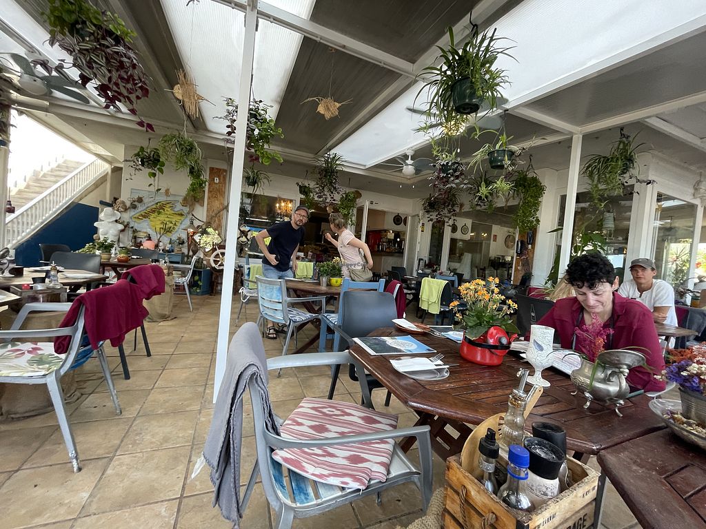 Bay view from inside the restaurant. Outdoor seating with a beach view…