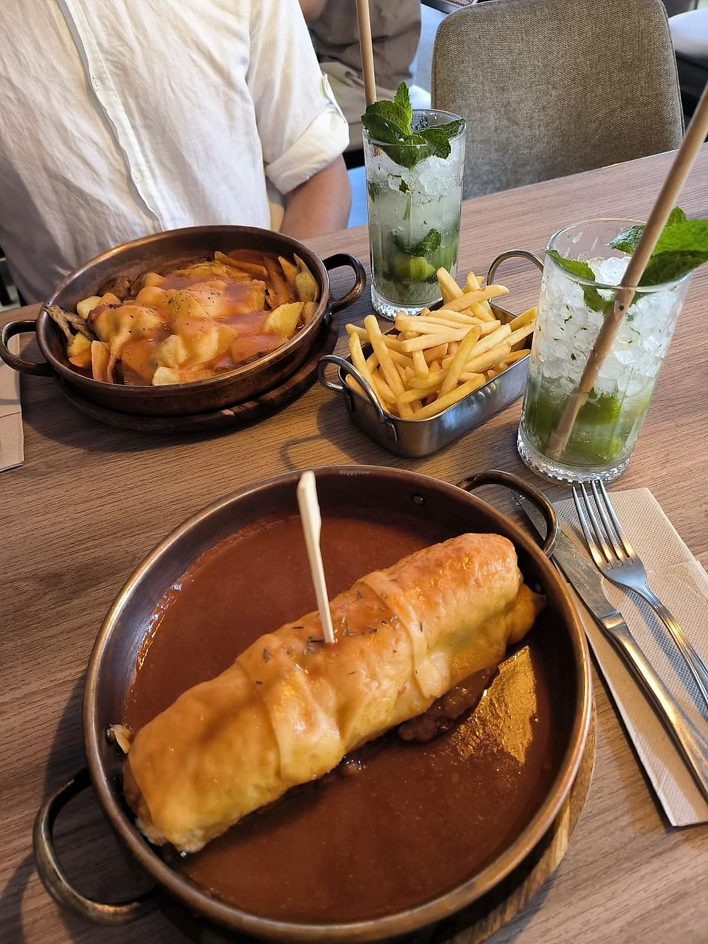 Lovely staff who explained the menu and gave us a free doughnut! Traditional dish Francesinha was delicious as well as the starters!