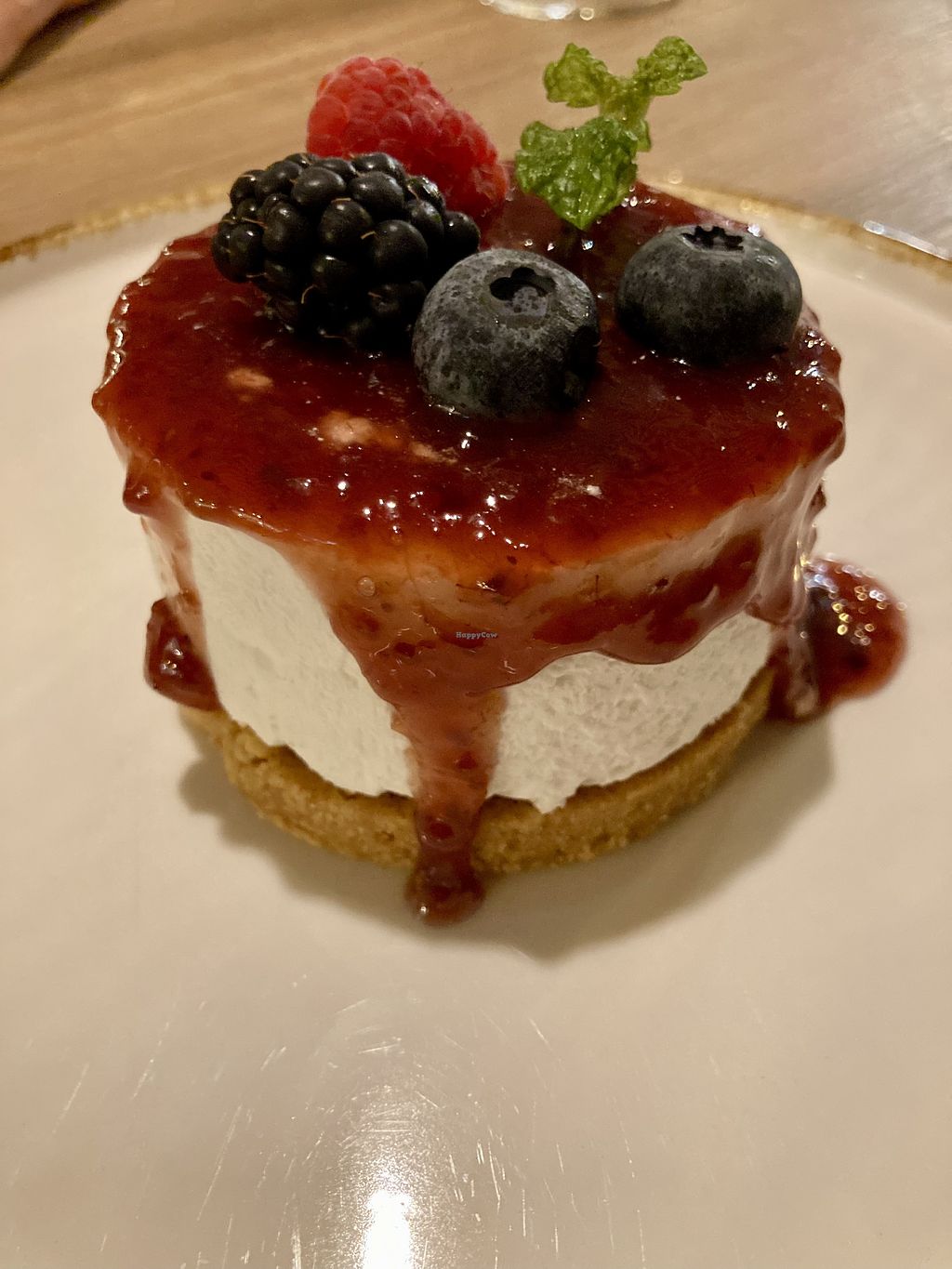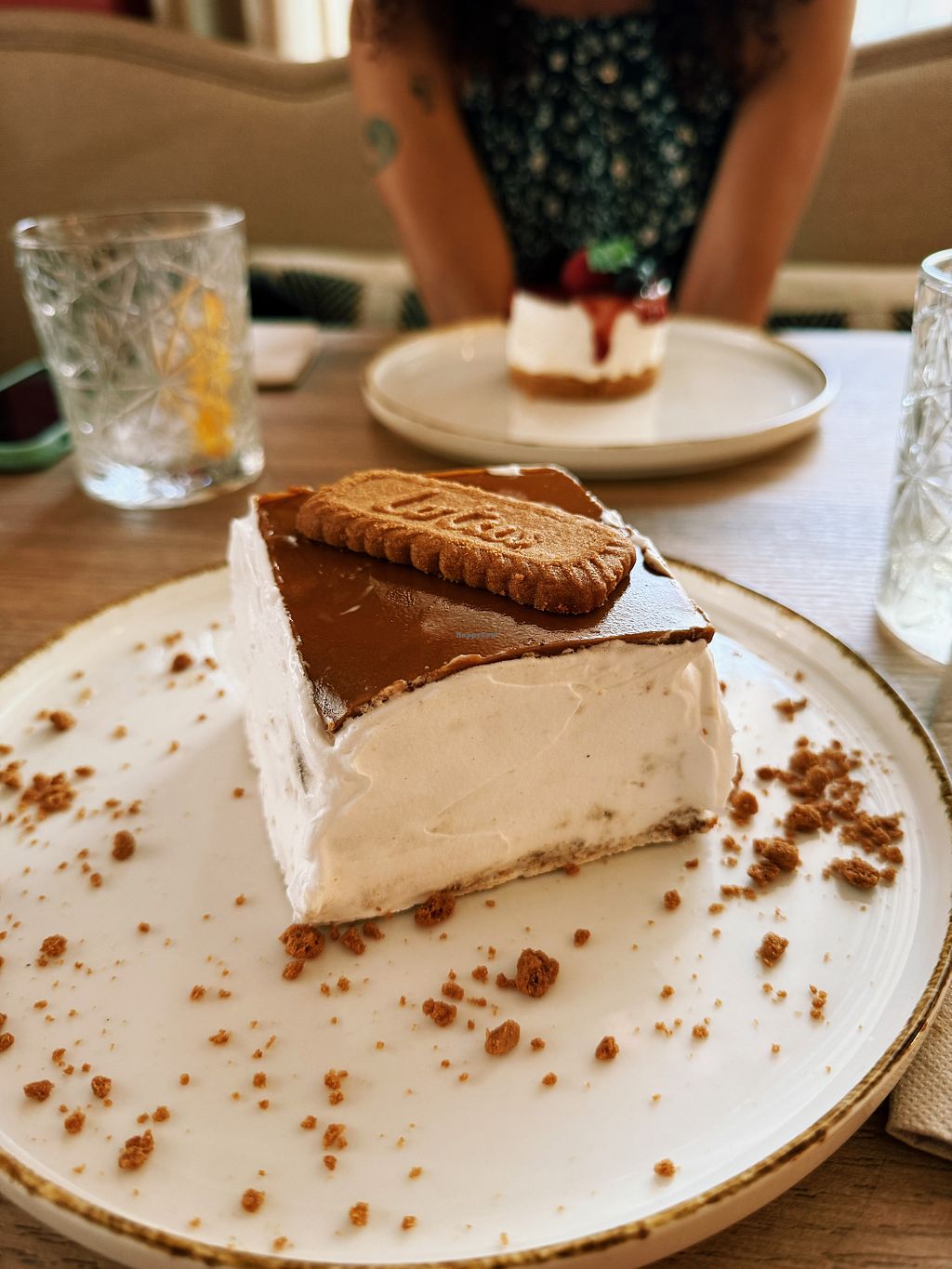 The second time we went there was our 7 year anniversary. We had the same starter but different main dishes. My girlfriend had what was basically a baguette bun filled with sausage, topped with cheese in a Francesinha sauce, and I had Patatas Rotas, which consists of seitan strips, sausage, potatoes and cheese in a Francesinha sauce. For dessert I had the cheesecake and my girlfriend the semifreddo.