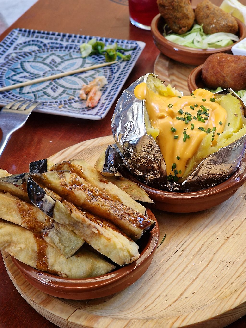 Situated on a big square, has a selection of decent easily labeled vegetarian tapas and dishes. We had the 5 tapas for 12€ made vegetarian. Portions are ok for the price.