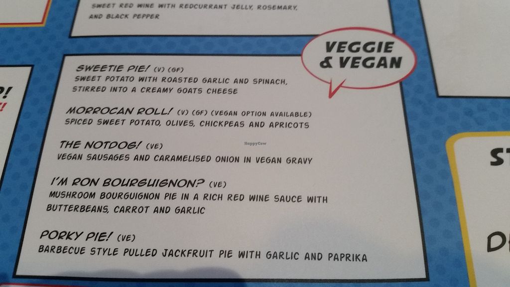 We looked for this place, having already enjoyed food from the Winchester restaurant. This one is quite a bit bigger and a bit smarter but still with the quirky feel. The food was just as delicious and the staff were lovely. Plenty of choice in vegan pies and lots for meat eaters too. I had the Porky Pie which was bbq'd jackfruit. They do vegan mash and gravy and the meal also comes with minted mushy peas with chilli. You can buy beer and wine or just have a tea or coffee. They do fruit smoothies too. You can play Top Trumps, find Wally or buy a comic to read. There is a car park just round the corner too. They do puddings and have ice cream but I didn't check for vegan options as I was too full. Will definitely go back so will ask then.