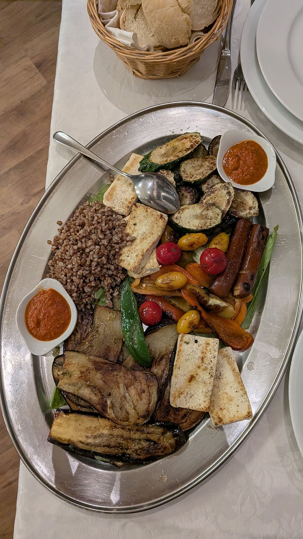 The vegan grill plate was aubergine, zucchini, paprika and tomatoes, as well as some tofu slices, a tofu sausage and some kind of chili dip.