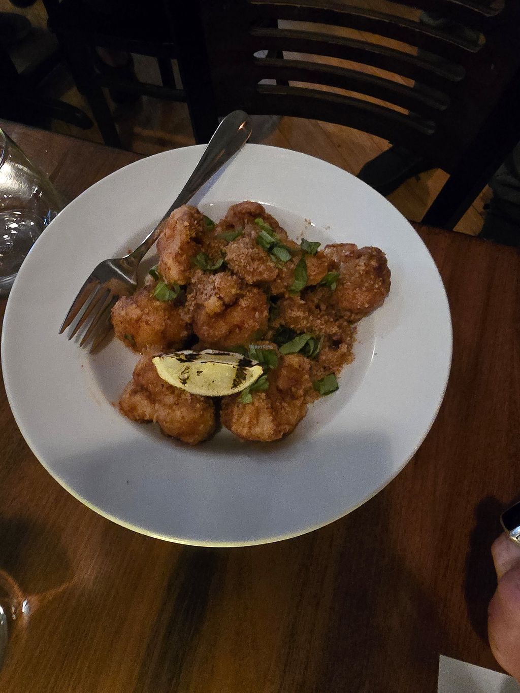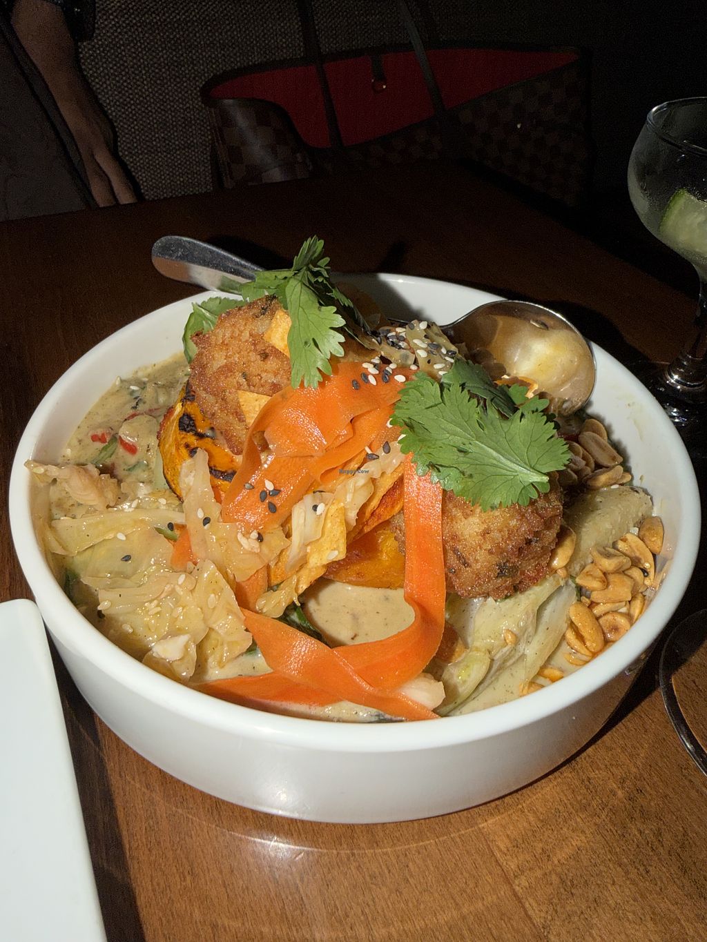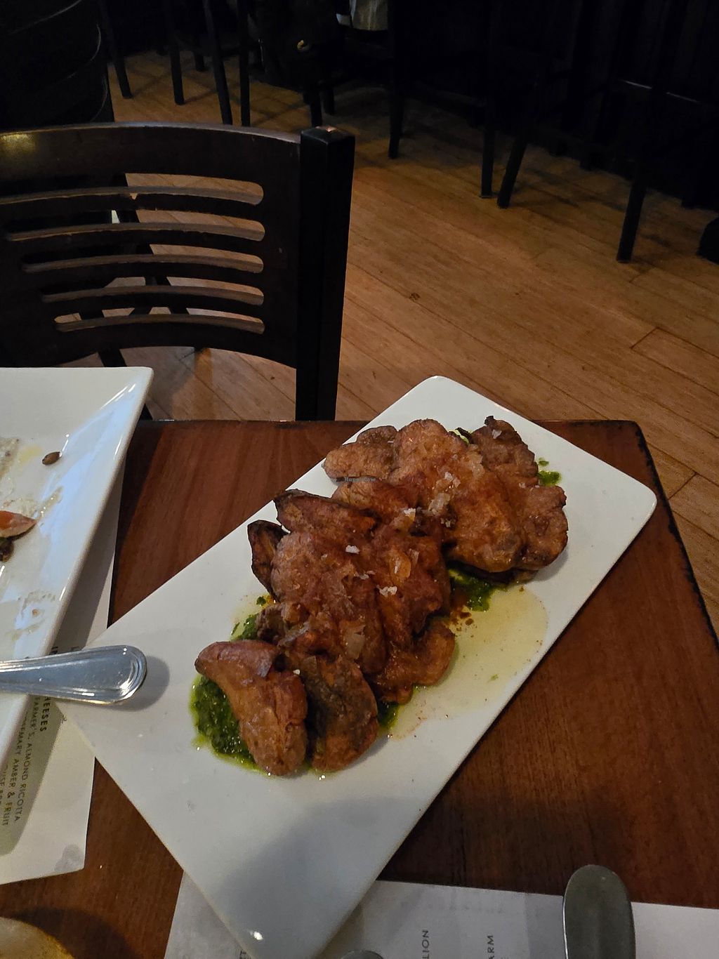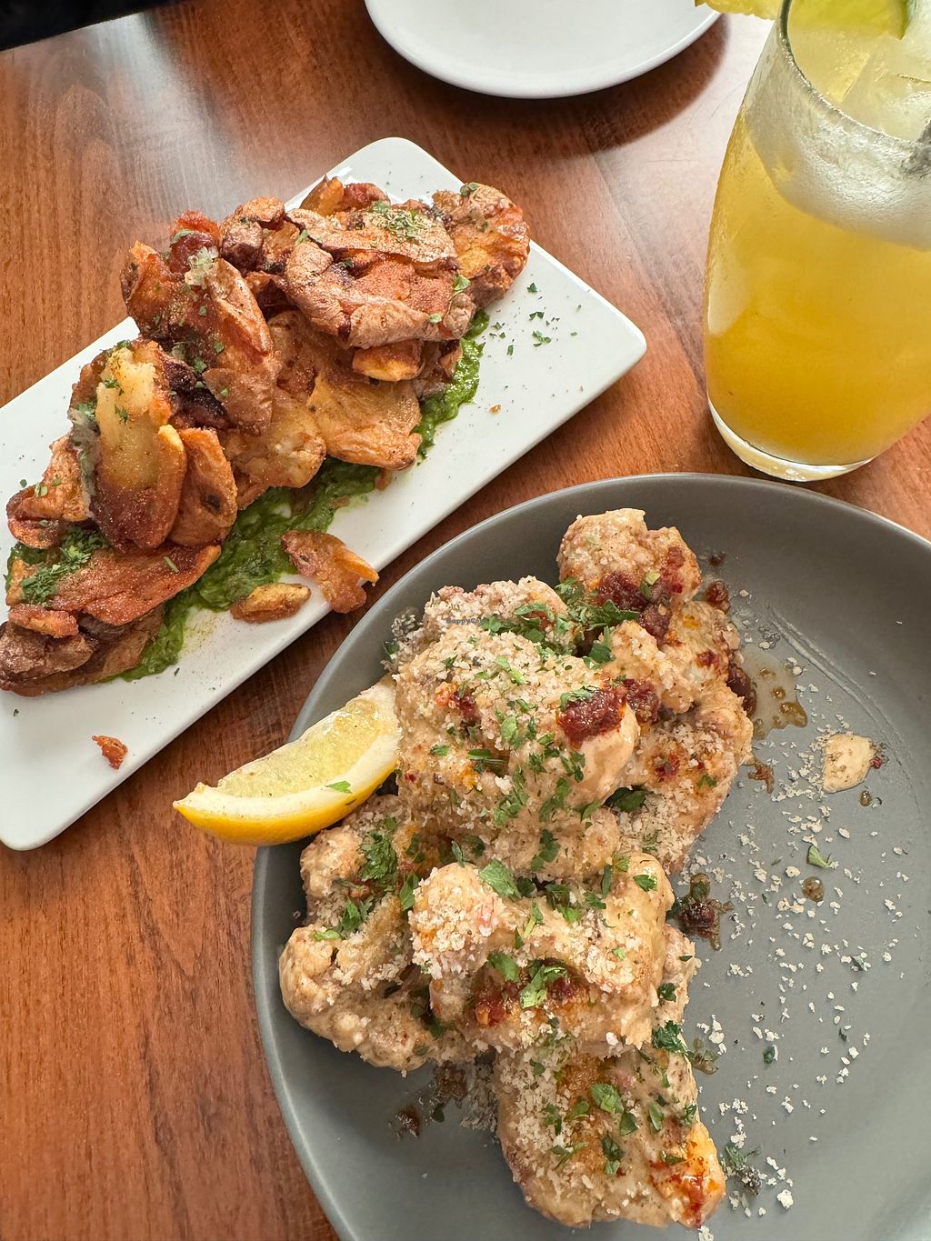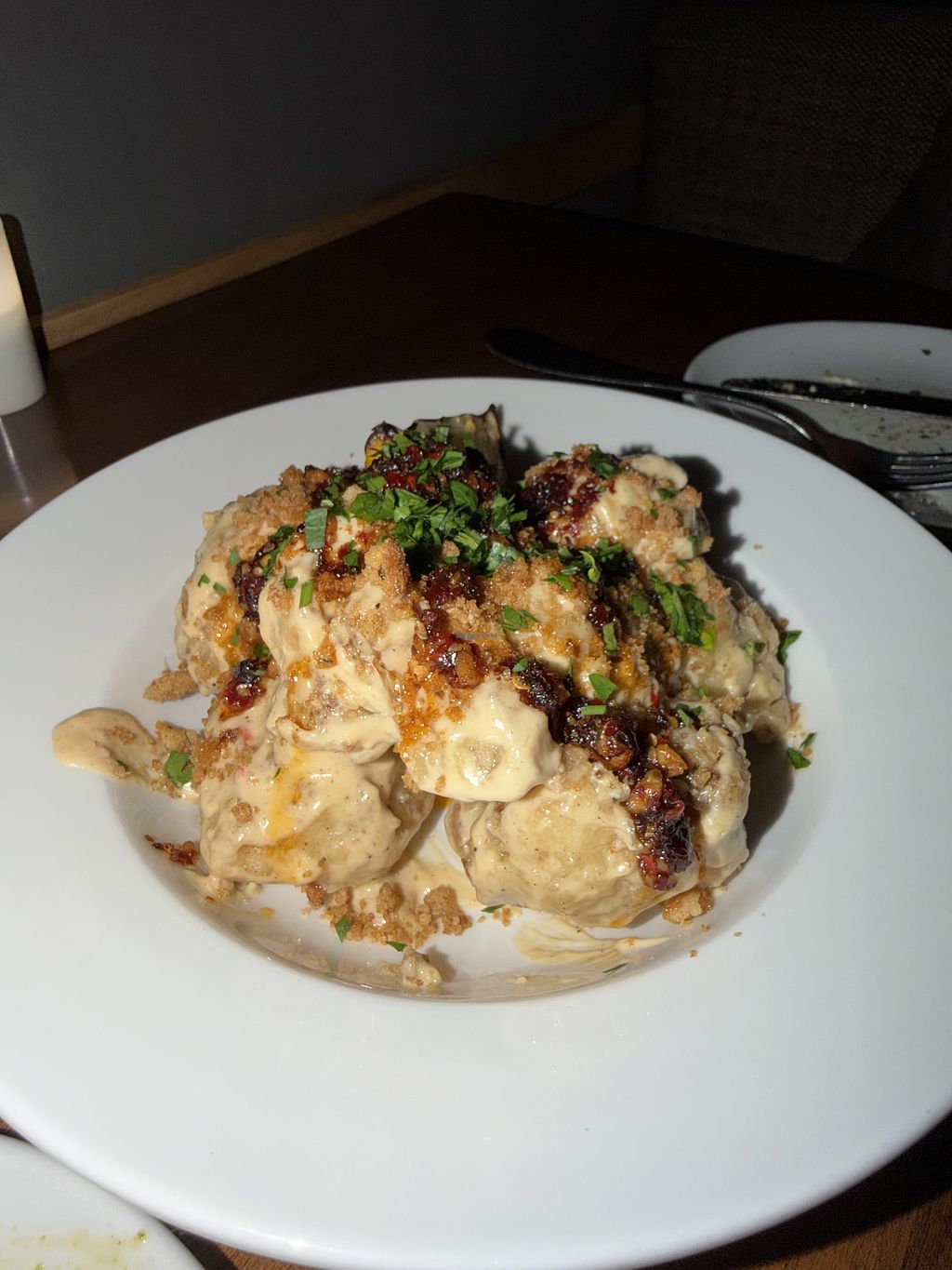 Let me preface this by saying that we came here two nights ago. It was so good that I made another reservation for tonight before we even left so I could try a few more menu items. The other night, we ordered everything we wanted: Cauliflower, Brussels, Cheese Plate, Ravioli, and Seitan along with a couple of cocktails for the appetizers and a half-price bottle of wine (because why not?). It was all incredible, but the Ravioli was my favorite! And the cheese-stuffed olives in the Savory Martini were incredible.