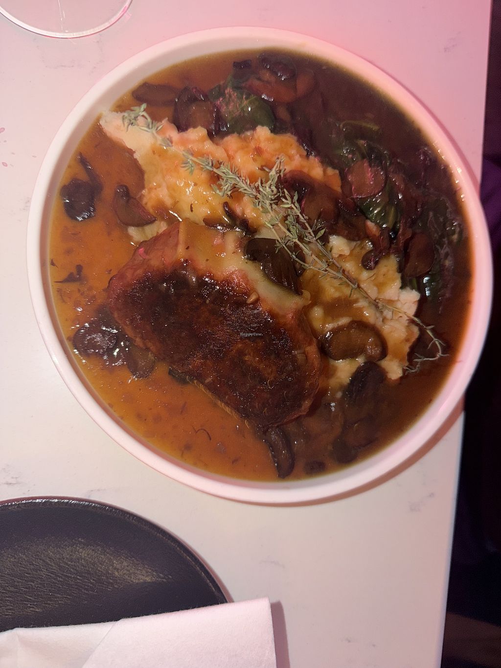 Arrived for a 5:15 dinner reservation on a Thursday the week before Christmas. We were seated in a nice quiet corner upstairs. Food was hit or miss. 2 of us split the chili cheese fries, Mac n cheese, maitake buffalo wings, and the ravioli. Fries (2/10) were too overloaded with meat and all you could taste was that signature beyond flavor which honestly was not good at all. The Mac n cheese was pretty flavorless (4/10). Maitake wings had a perfect texture and they were good but the buffalo sauce was like a little sweet? (6/10). The white bean and asparagus ravioli were delicious (8/10). We also ordered a brownie sundae which was pretty good (7/10). Likely would not return but I appreciate the concept of them donating profits. Also, our waiter had a bit of an attitude.