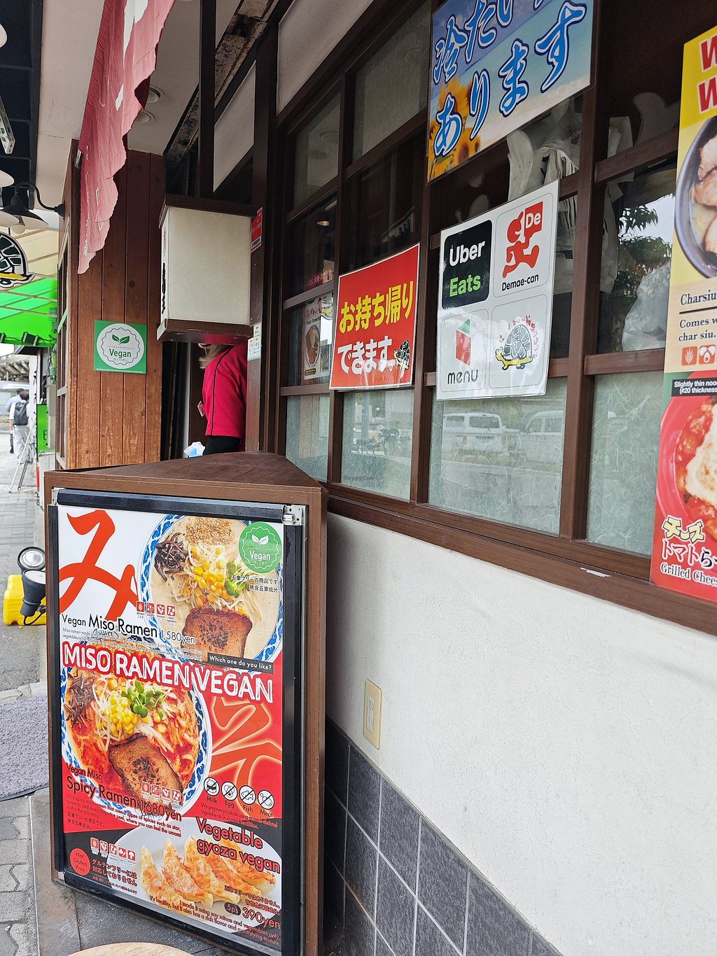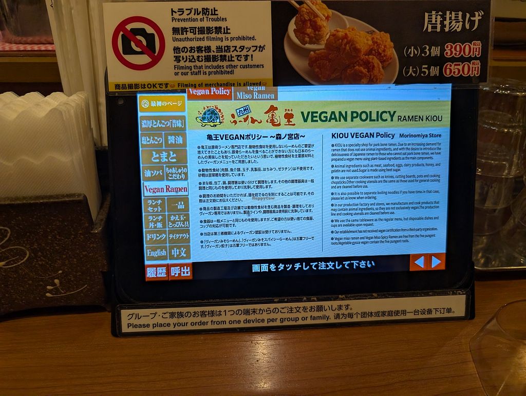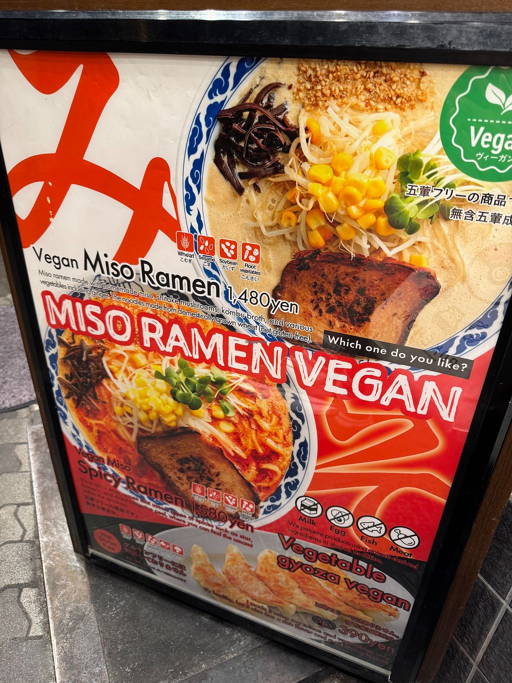 Not the tastiest bowl of ramen I've had in japan but not the worst either. They give 2 options (miso or spicy miso) and vegan gyoza. The portion size of the ramen was massive and kept me full all day!