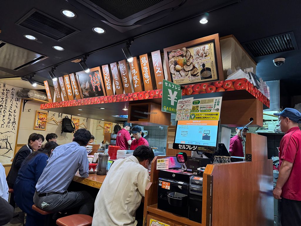 Serves meat, vegan options available. Japanese ramen restaurant. A typical Japanese ramen restaurant offering two types of clearly labeled vegan ramen with vegan “chashu” meat as well as gyoza. Open Mon-Sun 7:00am-11:00pm.