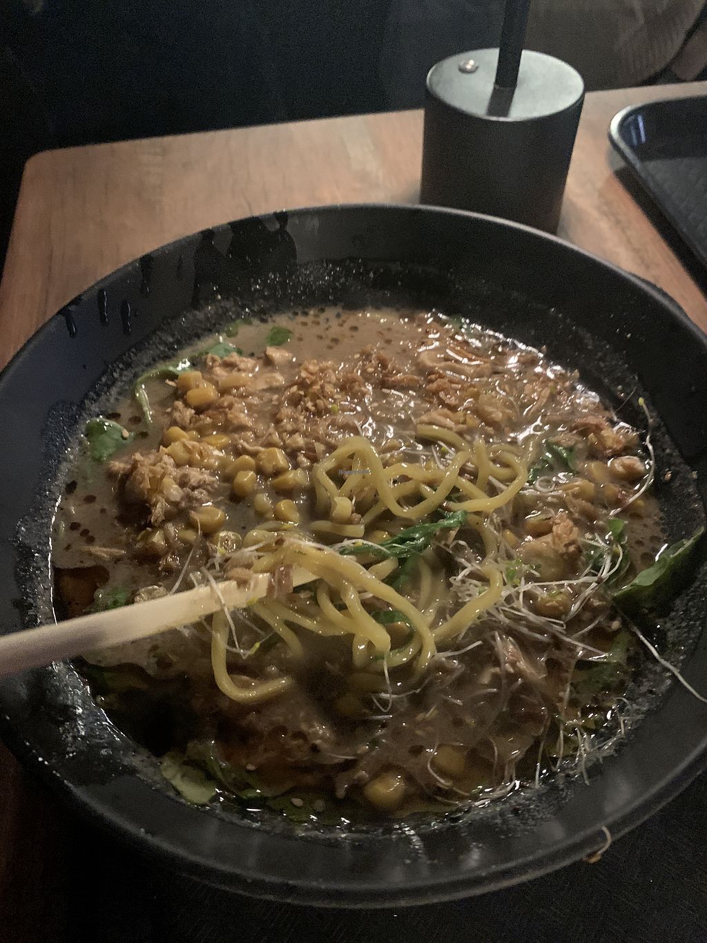 The restaurant is not fully vegan, but the menu is largely vegan. #3 garlic miso was very tasty! Would definitely go back. Quick service. Cozy atmosphere.