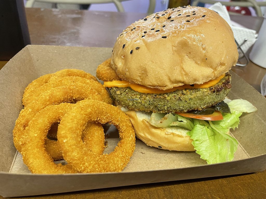 We tried the tofu, chicken and red pepper burger and liked the last one the most! But really all of them are good, just like their onion rings.