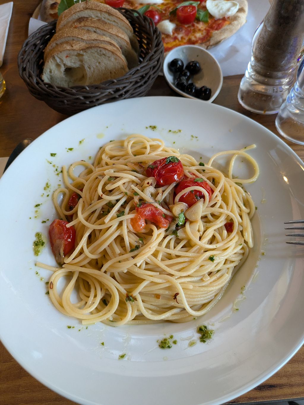 Italian restaurant with lots of seating both indoors and outdoors. We got complimentary free bread and olives which was nice. I had a pasta dish and it was ok.