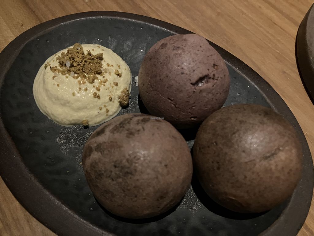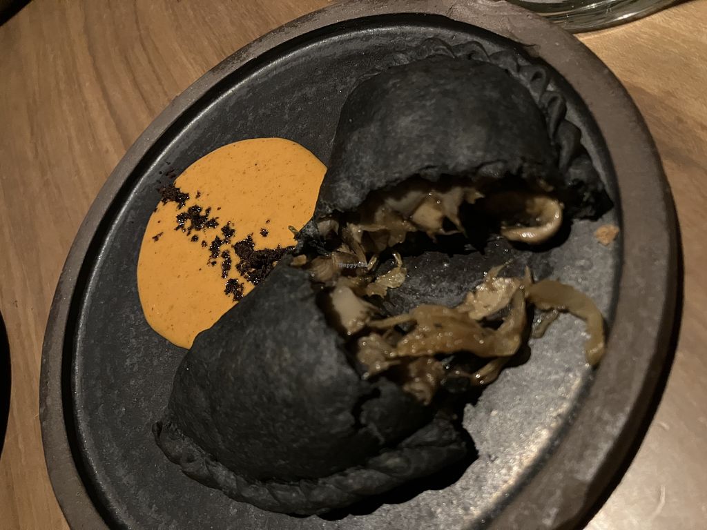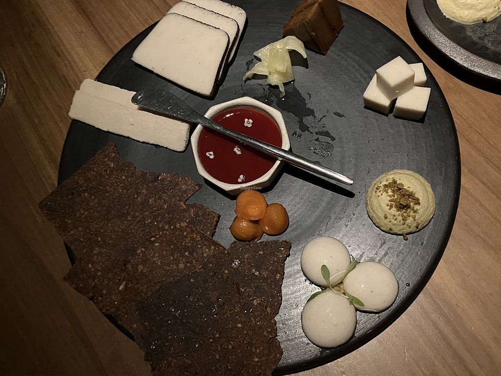 esquerda: ricota de castanha de caju com cogumelos e caldo de algas, d…