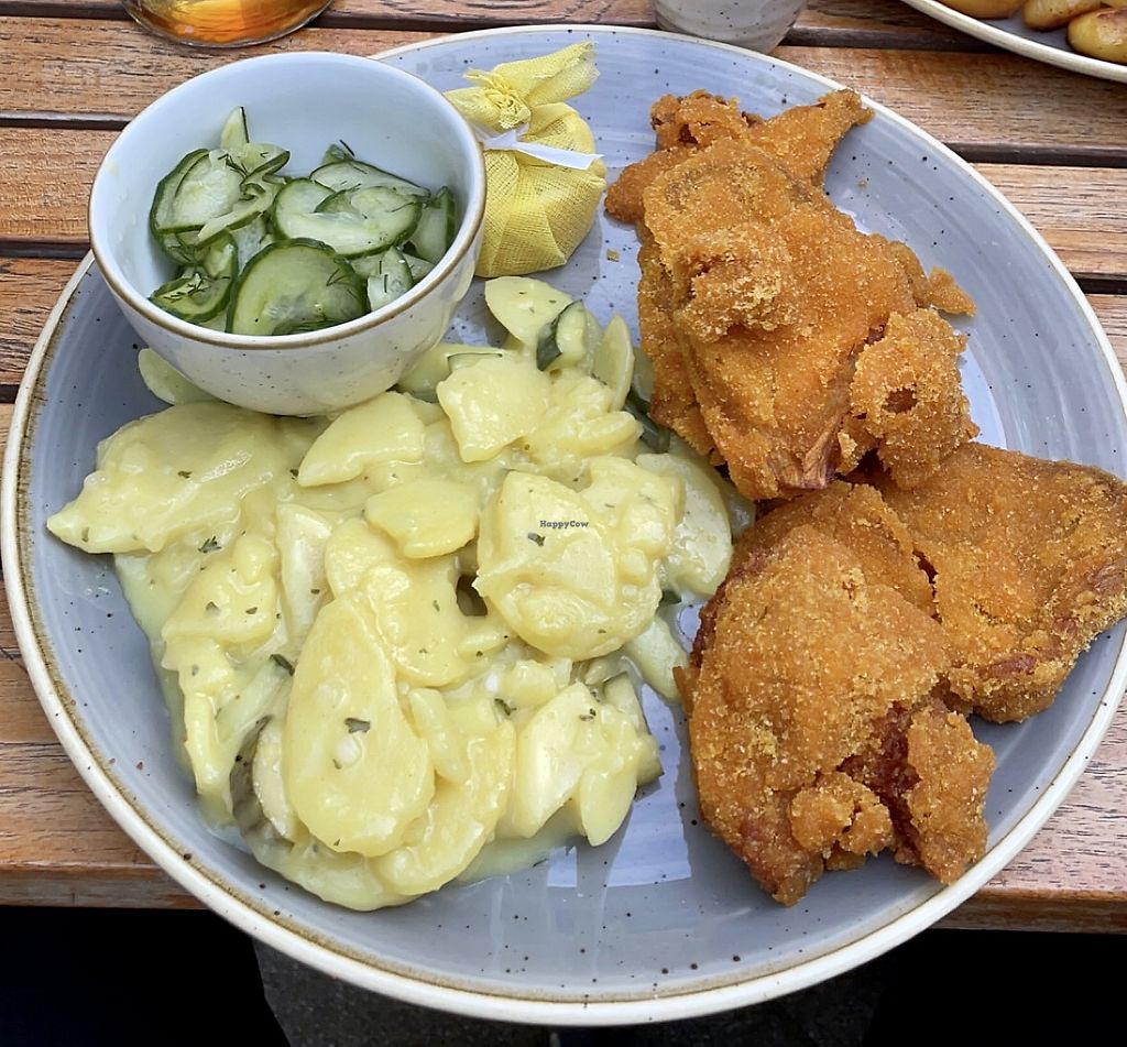 Serves meat, vegan options available. Modern German restaurant with vegan choices. Menu includes vegan garden vegetables with beetroot sunflower dip, beet tartare, vegan carrot currywurst, appetizer salad, lentil salad, vegan oyster mushroom schnitzel, soy roulade and more. Open Mon-Sat 16:00-23:00, Sun 12:00-23:00.