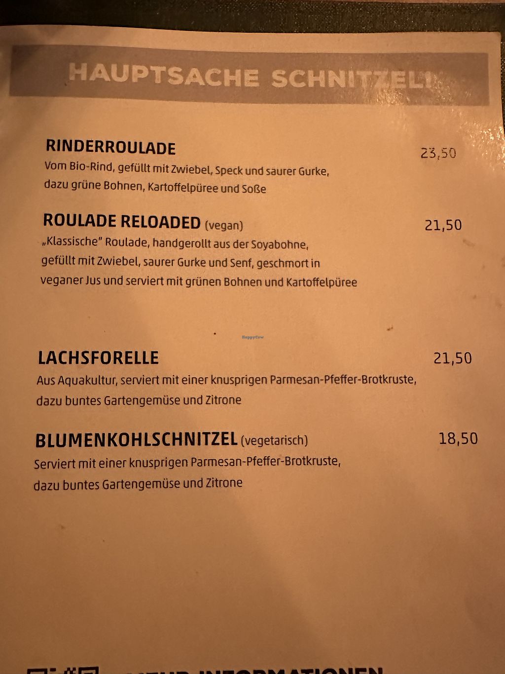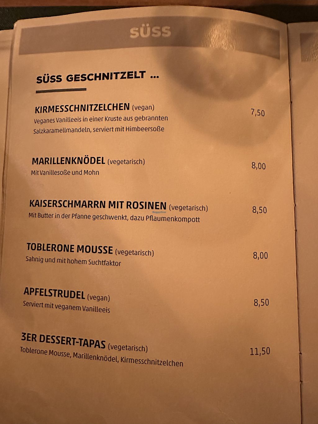 Endlich mal ein Restaurant, das deutsche Küche anbietet und auch an die Veganer:innen gedacht hat. Es wurden, passend zum Restaurant und zur deutschen Küche, vegane Optionen entwickelt. So steht nichts mehr im Wege, auch mit Mischköstlern (die nicht vom Fleisch abzubringen sind) gemeinsam essen zu gehen. Ich hatte die „Roulade Reloaded“ und als Nachtisch den Apfelstrudel mit Vanilleeis. Alles hat gut geschmeckt und der Service war sehr aufmerksam und freundlich. Ich werde definitiv bald wieder hin und das Austernpilzschnitzel probieren.