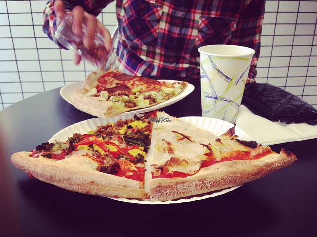 Great pizza dough, great toppings, my favorites were the Buffalo cauliflower and kale seitan, would return. Please make sure to stop by with intentions for pick-up at this location only because they have limited seating.