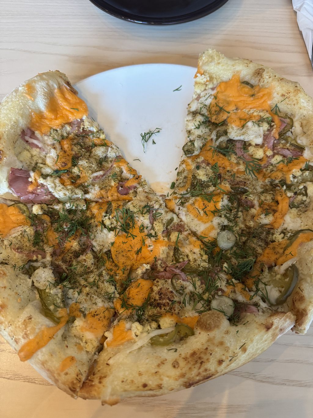 Pizza are made using sourdough and their homemade cheeze is to die for. They have a rotating brunch menu and weekly menu items. Their seitan is so soft and juicy!