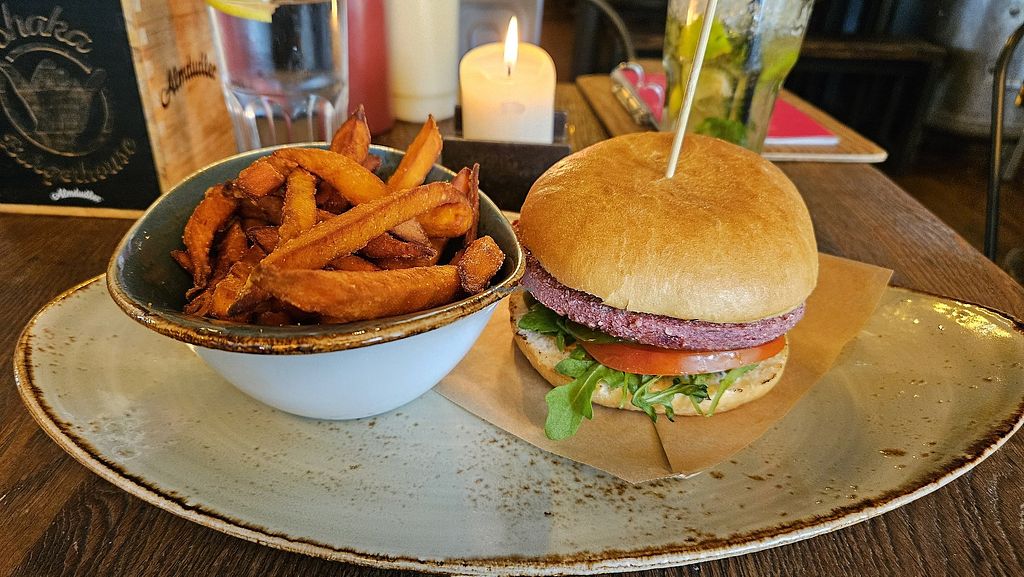 Sehr leckerer, Veganer Burger aus frischen Zutaten. Auch die Kartoffelecken und Süßkartoffel Pommes sind knusprig und würzig.