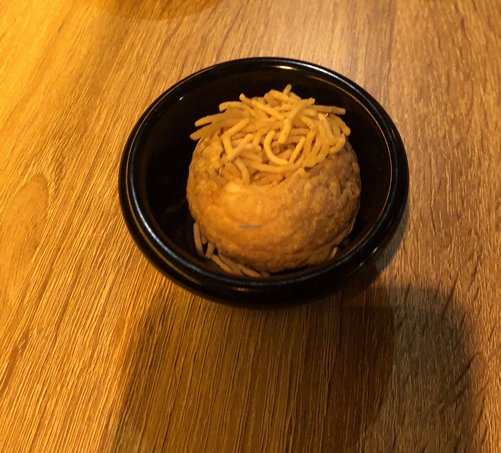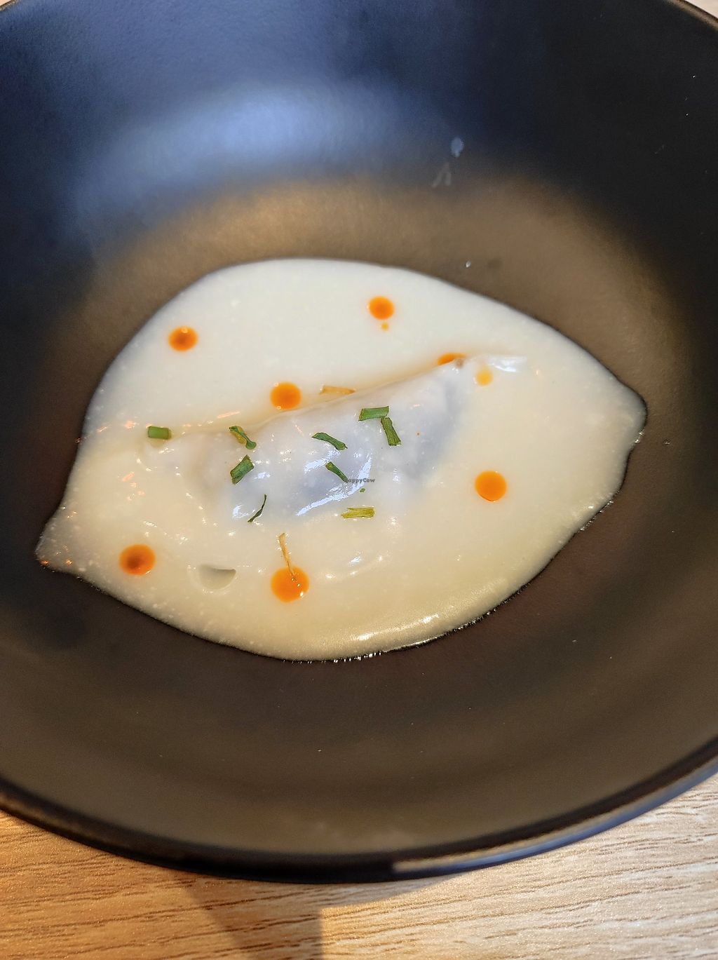 It's a nice concept, and the service was absolutely stellar, but the food fell a tiny bit short of my high expectations, since this is Madrid with so many top places for vegans. I had the tasting menu plata which has gyozas, bao, rice ball and creamy ramen. The gyozas were nice and lightly spicy "Spanish spicy" as the server called it.