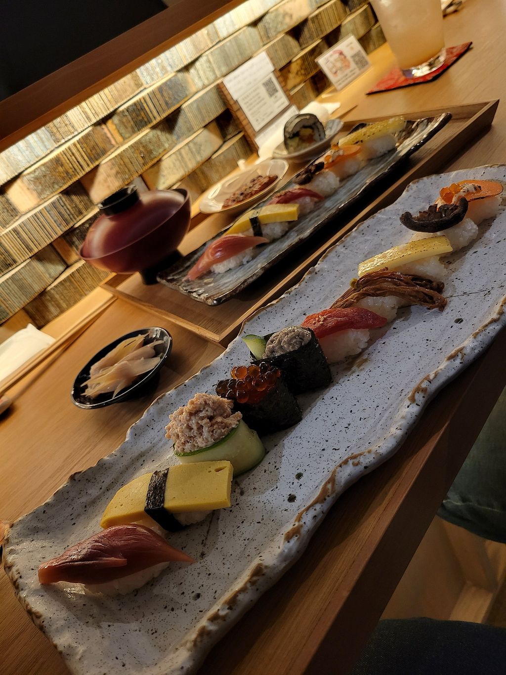 You order by scanning the QR code and making your selections. I went with their vegan omakase set (¥2500) which contained ten pieces of vegan sushi made from a variety of ingredients. Presentation was delightful as every piece was meticulously crafted and there were a few hits such as their 'crab meat' and ikura pieces. A few others were nice but fairly simple such as carrot and mushroom.