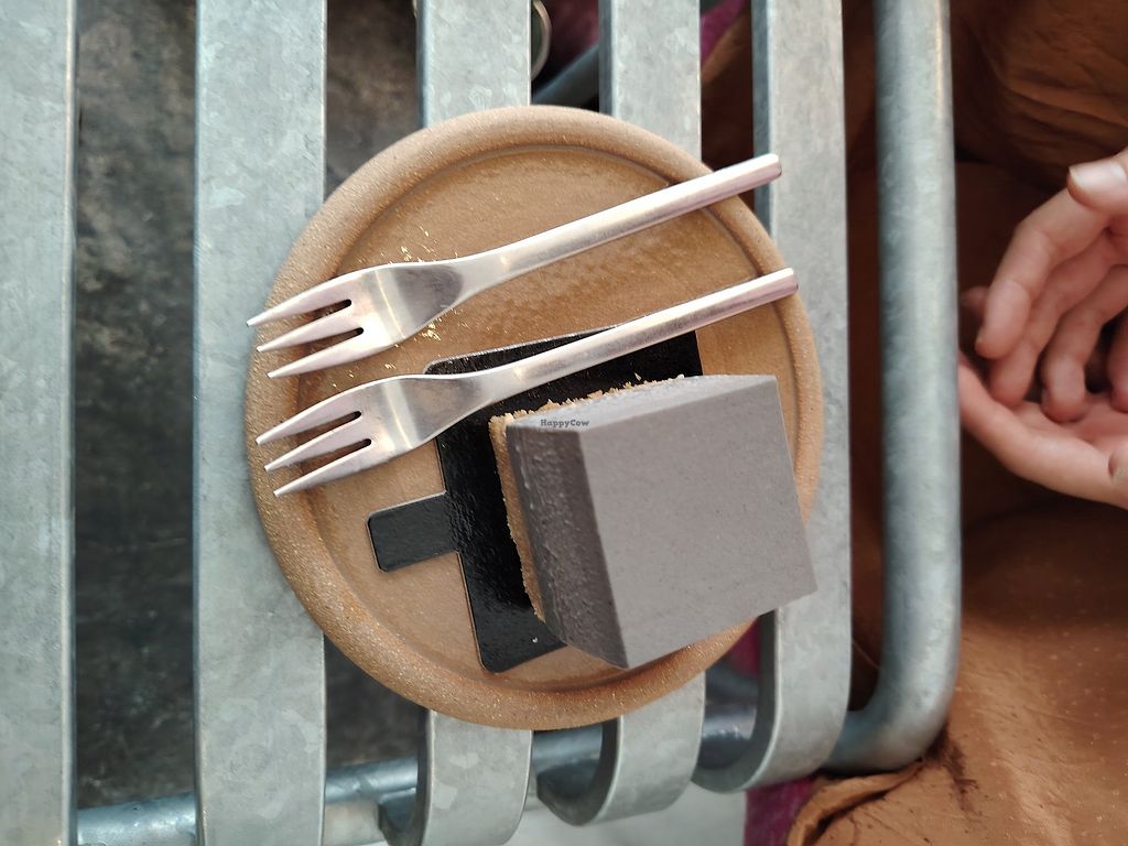 Mooi! Een grijs kubusje als gebakje. Helemaal van plantaardig materiaal. Het was zeer smaakvol ook.