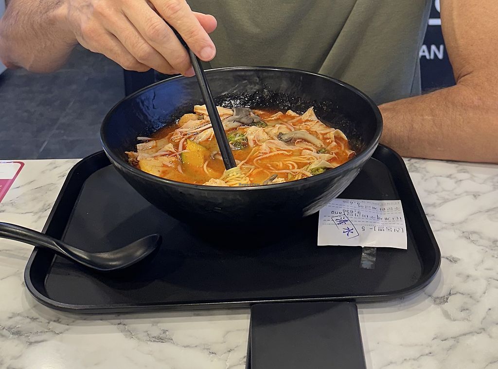 We loved this place and the food, it was sooo good. The concept is very easy: there is a Buffet of ingridients for the soup. You take a Bowl and put in all the ingridients you want to have. There are many vegan options, lots of veggies, Tofu, noodles, ricecake and much more. You than bring your bowl to the front and say you want the vegan broth. The staff speaks perfect english and will understand. They cook the soup for you with your chosen ingridients and it was sooo good. You can also choose between different hot spice levels. It was a great experience and I loved that you could chose what you want to have. Also the taste was really good and it was really cheap.