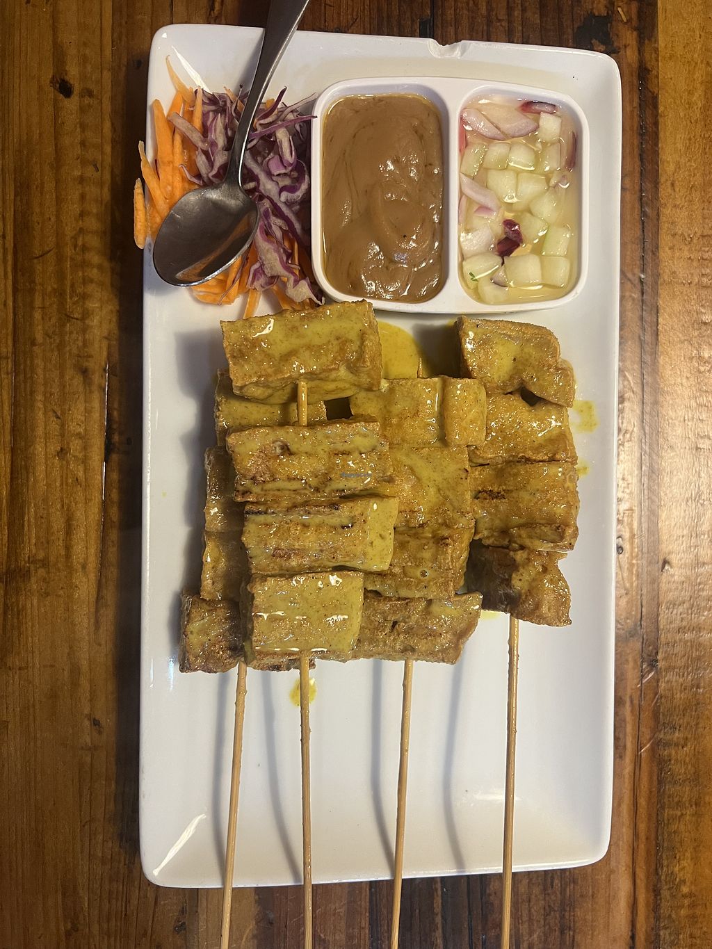 Serves meat, vegan options available. Thai restaurant with vegan mock duck and chicken. Example menu items include tofu satay, edamame, papaya salad, cashew nut stir fry, fried rice, pad thai and more. Specify no egg or fish/oyster sauce when ordering. Open Tue-Sat 11:00am-2:30pm, Tue-Thu 4:00pm-9:00pm, Fri-Sat 4:00pm-9:30pm, Sun 12:00pm-8:00pm. Closed Mon.