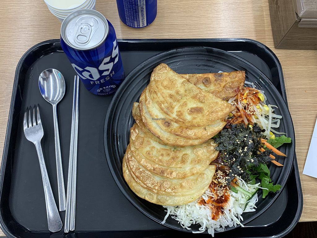 Ordered the flat grilled dumplings and couldn't believe the quantity of veggies. They fry half moon shaped dough which you tear off, fill with veggies and roll up to eat. Was surprisingly delicious as it was so fresh and the spicy dressing was yum. Had vegan options for gimbap, which they make to order - just tell them to omit fish, ham, and egg.
