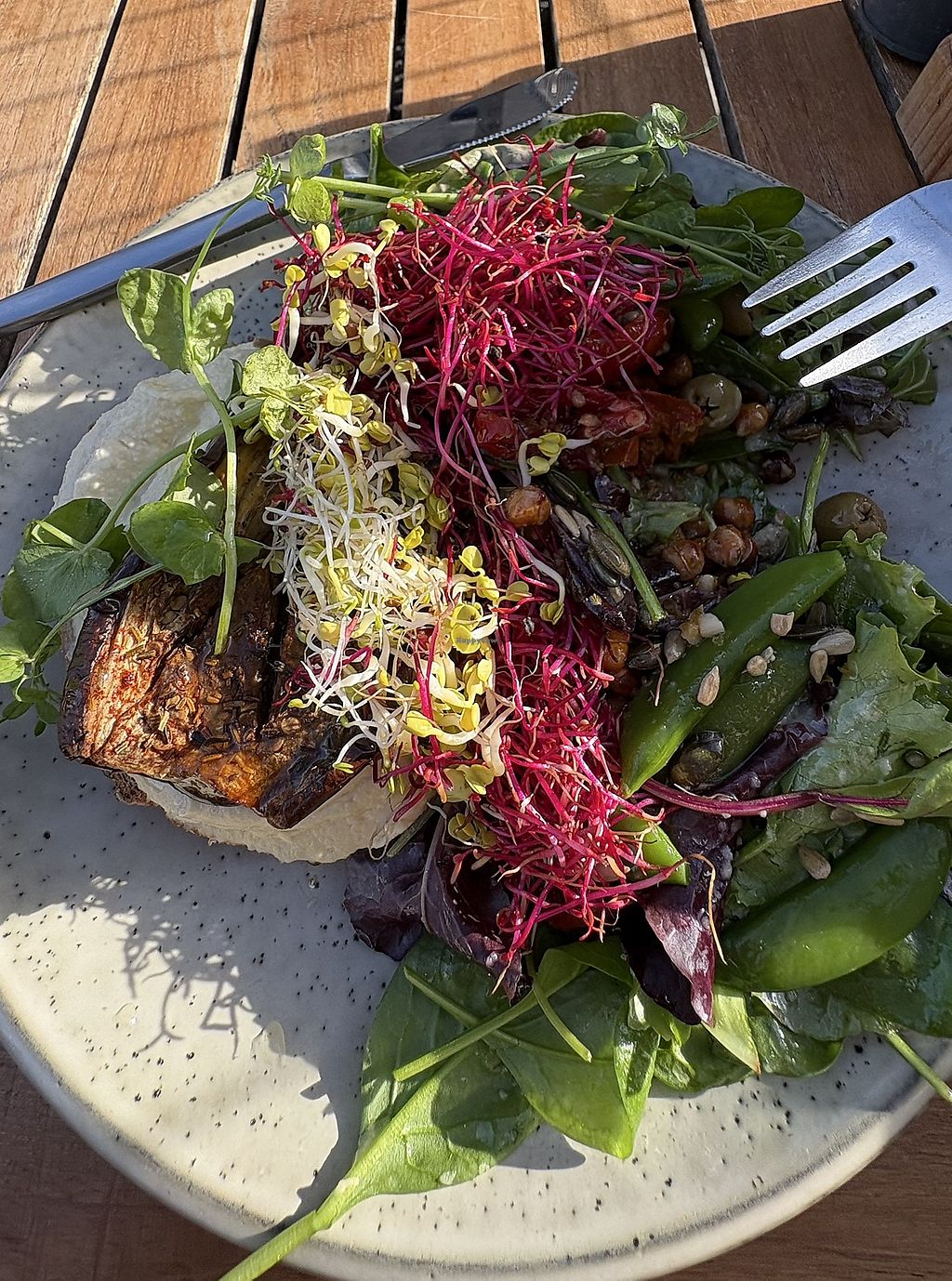 The mighty vegan brunch may photograph well and when I ordered it I was really looking forward to it. However the main event was not seasoned or flavoured with any herbs, the bread was soft so eating it with soft toppings went quite mushy and the vegetables on the side were also plain. With some more fresh herbs or a dressing this dish would be much nicer.