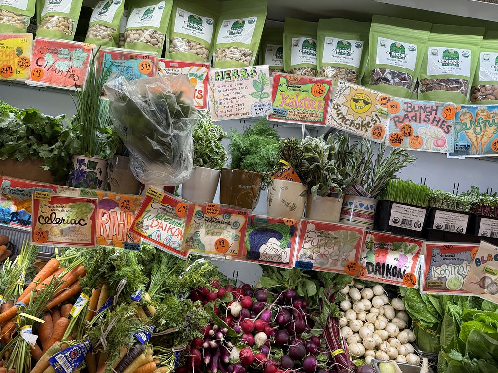 The produce section is all OG, much of it is local. They put tired looking produce on sale for 50% right away; you can get some treasures there. The mushrooms are divine here, the best and only place to go for any kind of mushrooms, most (all?) of which is local. Really the produce is the highlight, but they spend a lot of time prepping the veggies before staging them, maintaining them, and it really shows. Great produce section, though the quarters are tight. So the best mushroom selection in terms of breadth and in terms of quality and freshness. This alone makes it the best HF store I've ever been...