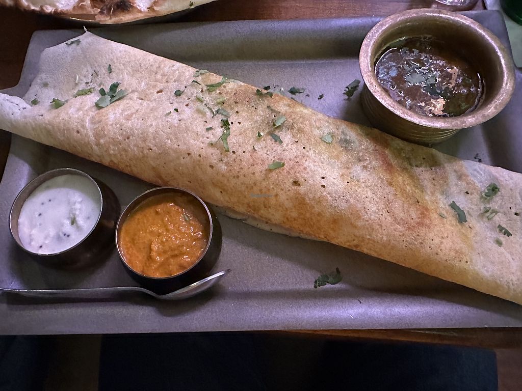 Serves meat, vegan options available. Indian restaurant with clearly labeled menu. Example dishes include aloo madras, vegetable soup, plain dosa, banana curry, vegan thali and more. Open Mon-Sun 11:30-01:00.