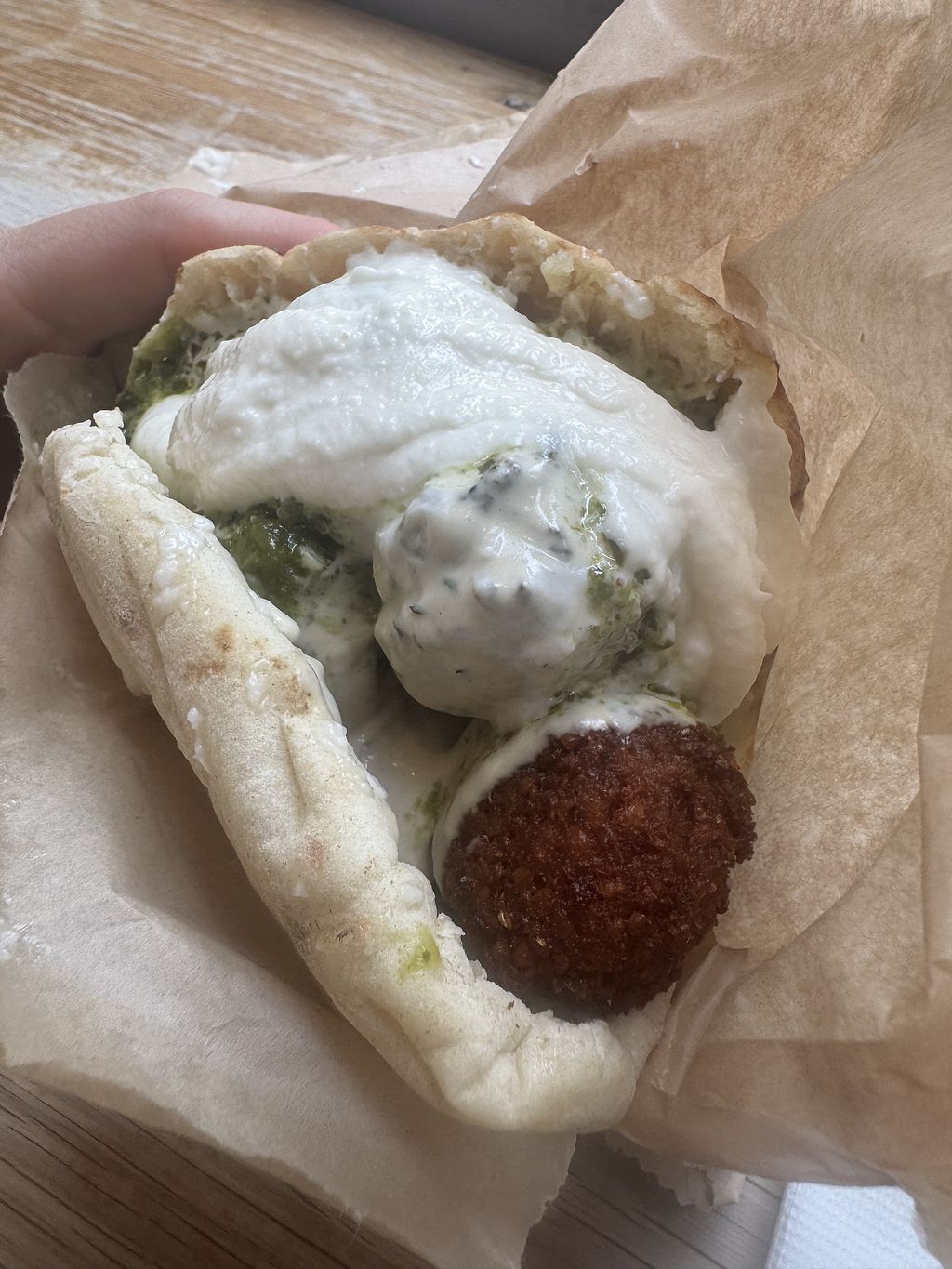 I got a falafel pita with the green and red (spicy) falafel and topped it with tahini, s’rug and whipped garlic. The falafel and sauces were very good, especially the red falafel. But the sandwich was only just Ok—all the falafel was on top with other fillings all on the bottom. The pickled cabbage was weirdly sweet and the hummus was pretty bland. Once I got past the falafel, it ran out of flavor. I might come back for the spicy falafel but not sure I would go for the sandwich again.