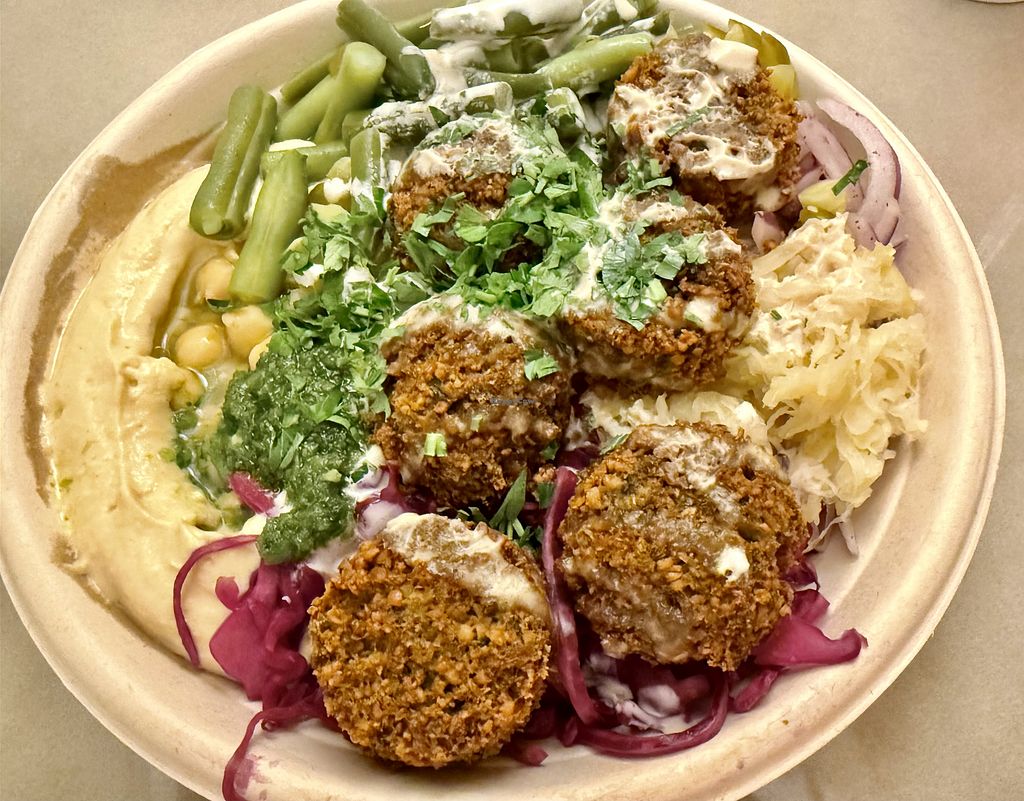 Serves meat, vegan options available. Fast-casual Israeli Mediterranean eatery. Serves vegan falafels, salads, and bowls. Est. 2020. Previously vegan but reported January 2026 to serve meat under new ownership. Open Mon-Fri 10:00am-9:00pm, Sat-Sun 11:00am-8:00pm.