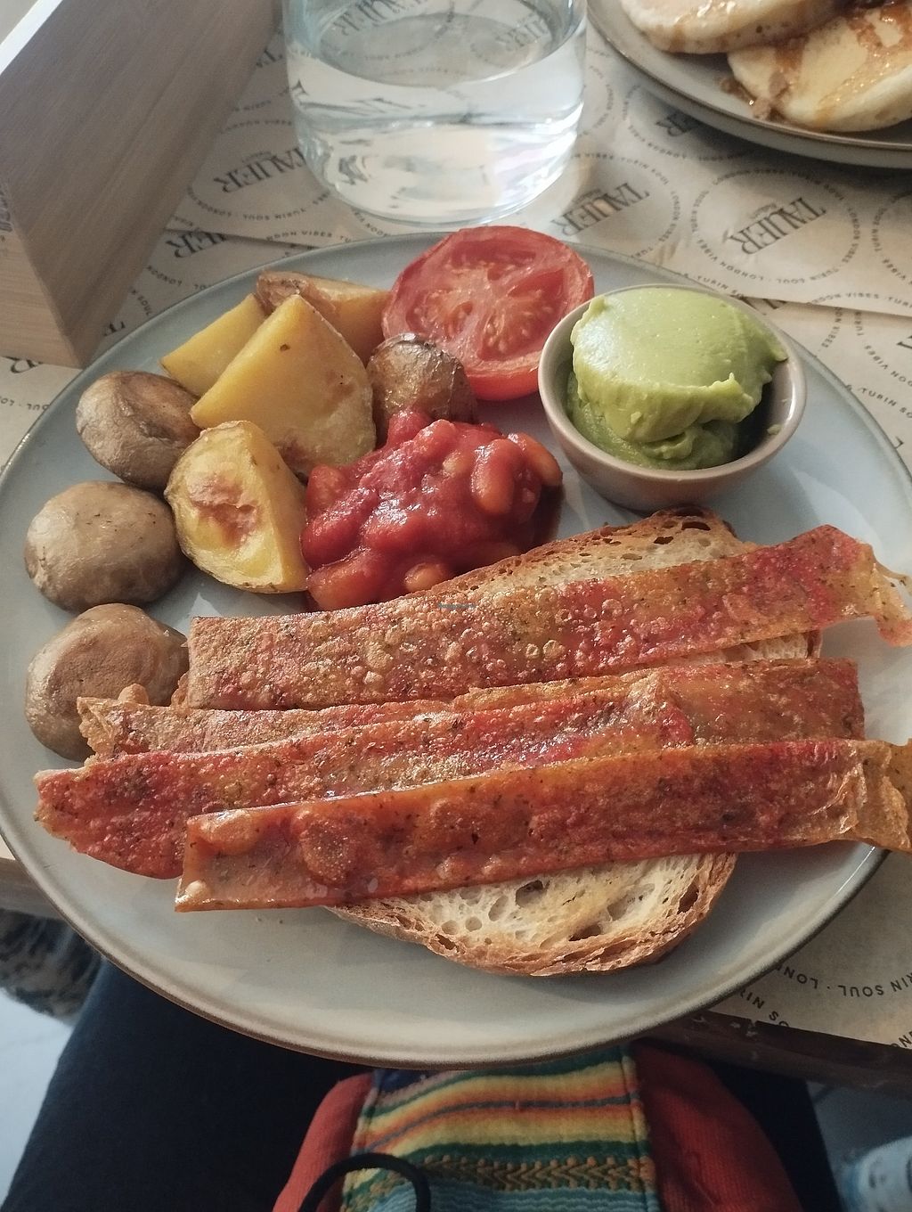 Super easy going through the menu as practically all items can be turned vegan. I had the savory vegan pancakes with "bacon", pancakes, some avocado crema and scrambled tofu. Everything was delicious.