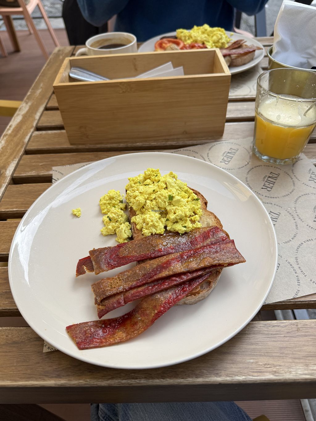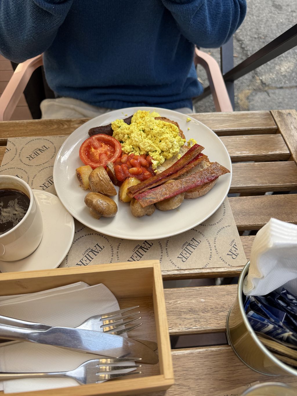 We opted for the full English, and tofu scramble with vegan bacon. Very nourishing, even if the tofu was quite bland. We also got an apple plum and chai cake, and a vegan Nutella cookie which were amazing. I think the English breakfast was €15 and the tofu scramble was €9.