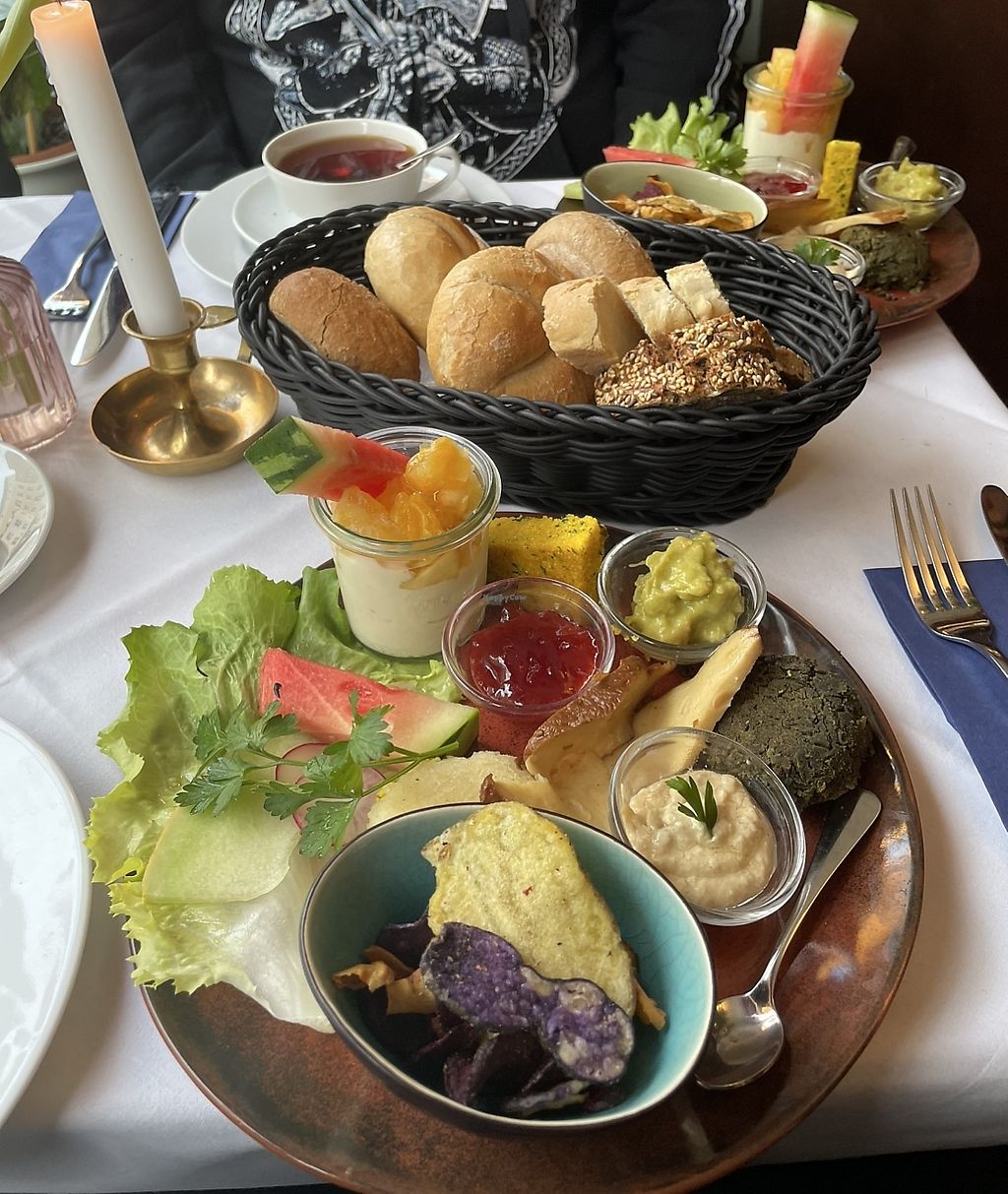 Die Teekarte ist ein absoluter Traum und selbst für ein Teehaus super umfangreich! Wer Tee mag, ist hier richtig. Es gibt alles von Standart-Sorten über aromatisierten Tee bis hin zu Teegetränken wie Chai Latte und außergewöhnlicheres wie London Fog. Bietet auch Kaffee und Smoothies/Säfte an. Hafermilch ist ebenfalls verfügbar. Neben dem großen veganen Frühstück gibt es noch ein kleines veganes Frühstück, ein veganes Sandwich und das Porridge kann auf Wunsch mit Hafermilch zubereitet werden. Zudem gibt es noch mehrere vegetarische Optionen. Das Personal war sehr aufmerksam und zuvorkommend ohne aufdringlich zu sein. Schöne Atmospäre.