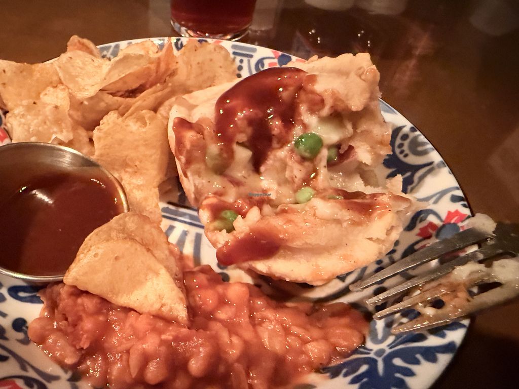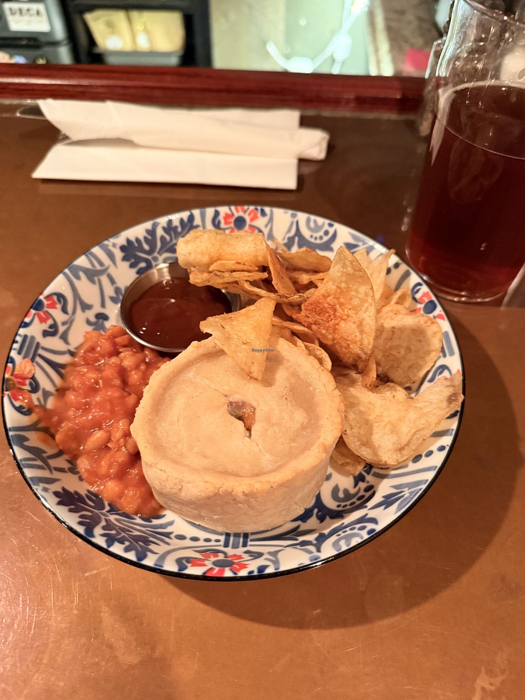 The vegan pot pie (called veggie but really vegan) was delish. Came with beans and potato chips. Not quite a full portion if you’re starving but it was delicious and creative. Took about 25 min though, beware.