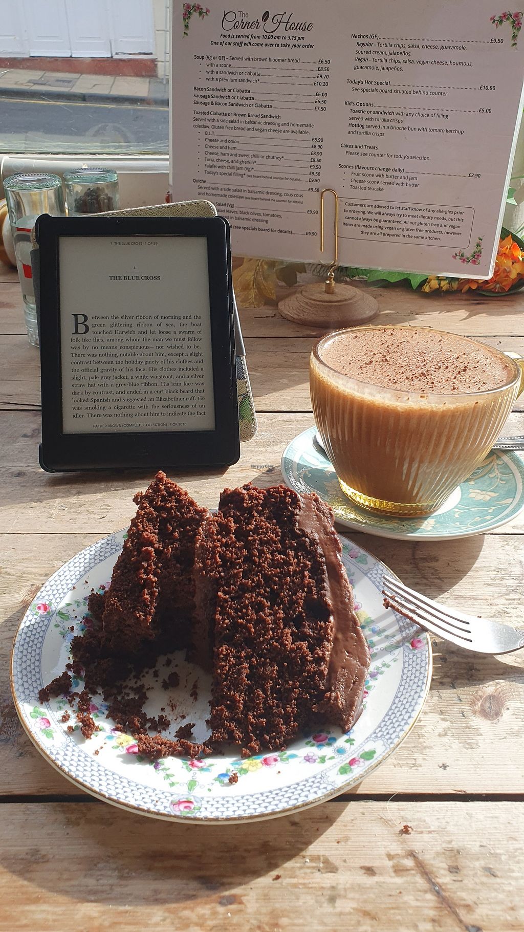 Well, it's certainly on a corner and part of a house, so yes it meets these criteria. It also meets the criteria of an inquisitive vegetarian or vegan traveller - to a very reasonable extent. Whilst the food menu is generally limited to soup, toasties, sandwiches and salads all with vegan choice it's worth checking out the specials board. That's exactly what I did and ended up with a tasty and very hearty chick pea and vegetable curry for £4.50. The vegan cakes are pretty special here. In fact, the peanut butter and chocolate one I tried was simply breathtaking. I love chocolate. I also love peanuts. So this was an instant sensation. Maybe even a 'New Sensation' as Lou Reed once sang. They also do vegan brownies and lemon cake. I suppose it changes on a regular basis. You feel very much at home here with super comfy chairs and lots of books of all categories to keep you interested. Unless, like me you have a tablet and read books electronically. The free wifi here in that case is quite essential. What's also good about this place is the coffee. It's made with pride and served in the same manner. This is without doubt the best place to go in Berwick for a coffee and vegan cake. In fact, it's probably the only place to go and indulge in this delightful activity. Pull up a seat at the window and find out for yourself.
