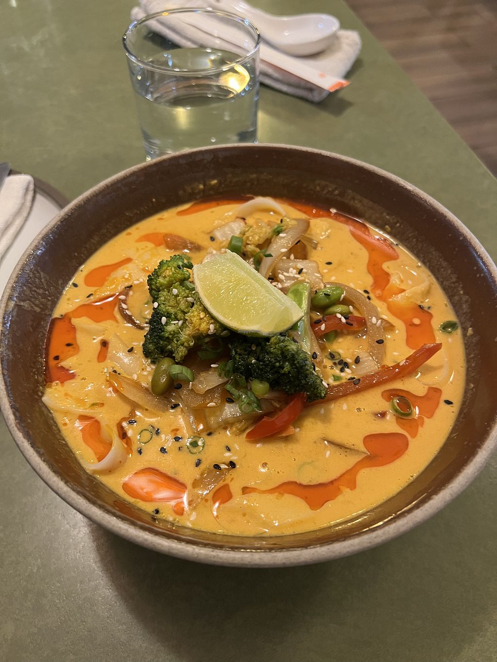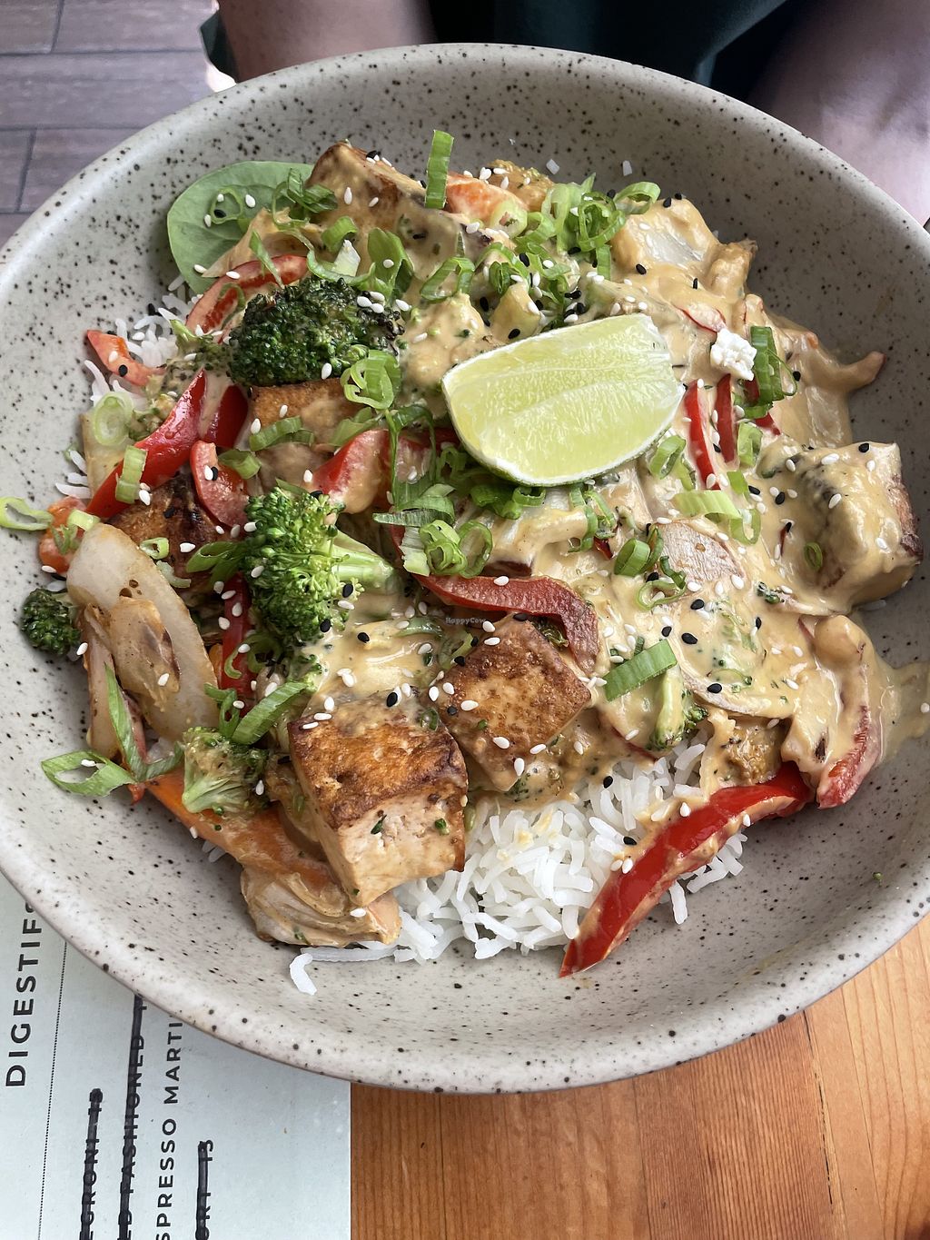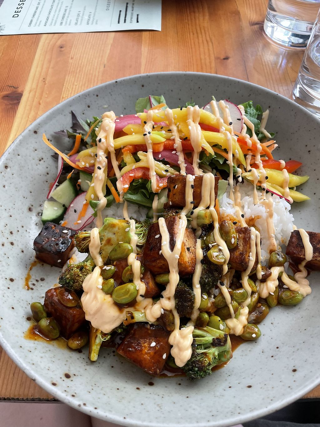 All vegetarian and mostly vegan. I have been going here for years and I keep coming back. This time I ordered the broccoli satay starter which was the highlight, and I ordered the spicy tofu rice bowl but they accidentally brought me out the satay tofu bowl which I didn’t even mind because it was also tasty. Big portions and was able to take a lot home. Their cocktails are excellent and strong, I got the Oaxaca Sunrise. Very nice ambience good for a date night.