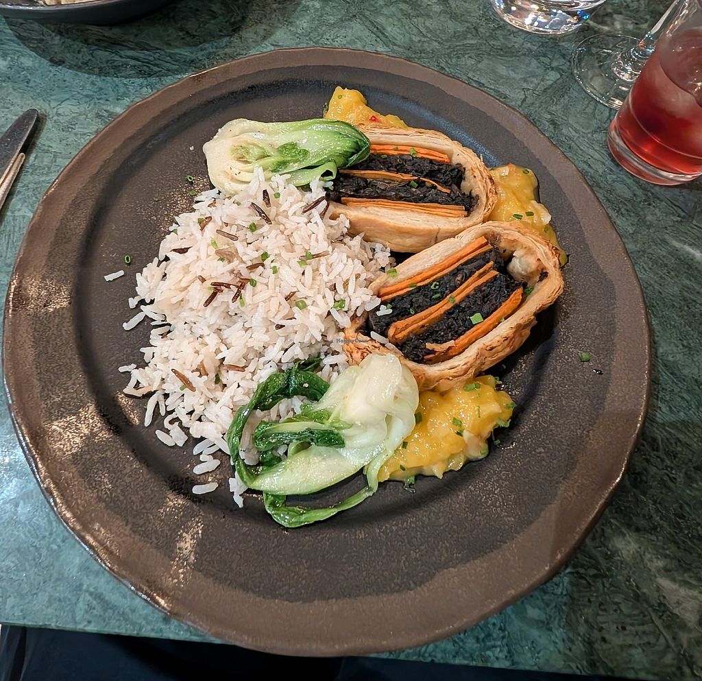 Read moreOrdered a raspberry and thyme soda which was so refreshing. First dish was a pastry dough containing spinach and a vegan ham-type meat with rice on the side along with bokchoy and mango chutney. It was all exquisitely tastey with the soft crunchiness of the dough, cooked spinach and mixing in a bit sweet chutney for a great blend of sweat and savory party in my mouth.