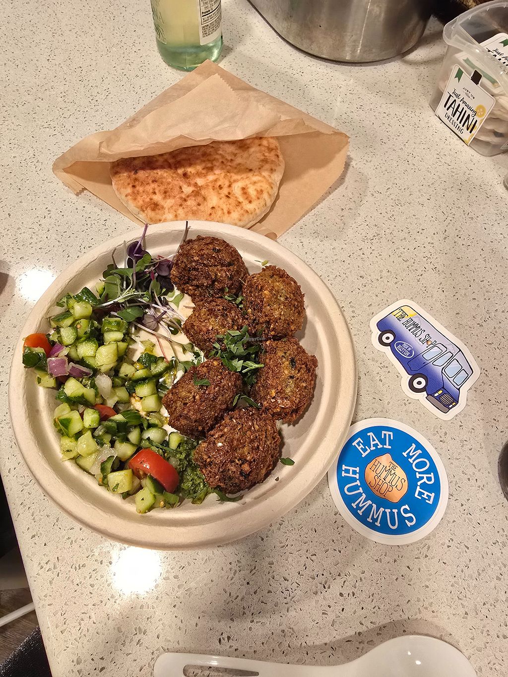 Say that 5 times fast, and hope you teleport here because this place exceeded my expectations. The food was awesome. I got the hummus bowl but you can also get the same dish as a pita pocket or salad. The soy-free (fava bean based) chicken schnitzel was perfectly fried and delicious. Lots of a lightly picked red cabbage and cucumbers. Some kind of vegan garlic sauce and a huge amount of hummus.