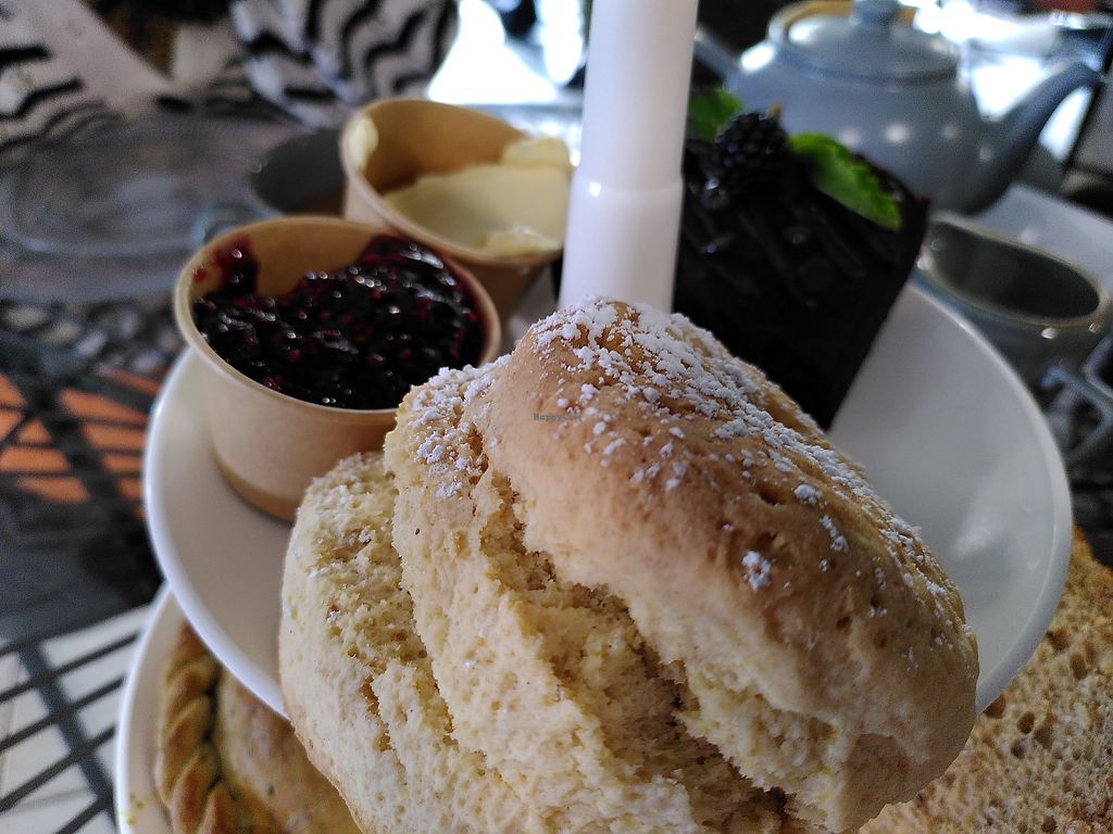 Limited options vegan wise, but the food and service was great. The staff had a specialized vegan menu for afternoon tea. The options were falafel and hummus or hummus and chili jam sandwiches, onion bhaji or steakless bake pasty for pies and biscoff cake (only option) plus vegan scones. There were a few different non-dairy choices of milk for the coffees also (almond, soy and oat I believe). Staff were excellent and so friendly. Dogs welcome too which was a bonus!