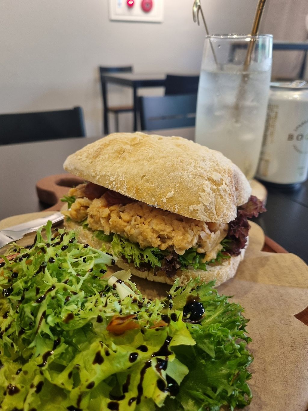 A very chill place with soft music, good food, kittens playing around, english menu and very nice staff that spoke english. Also really easy to find. I had the chickpea sandwich and sallad. Great place!
