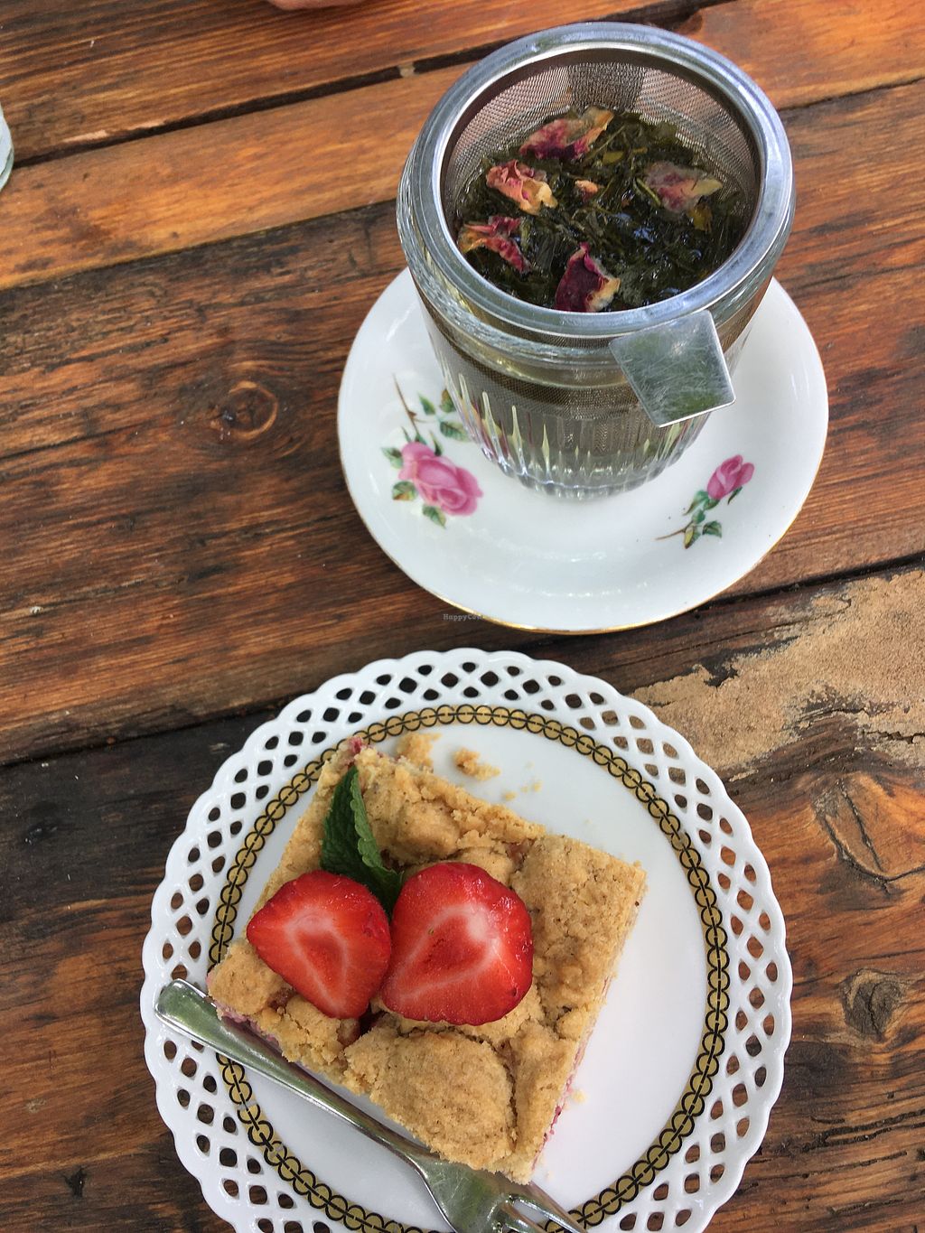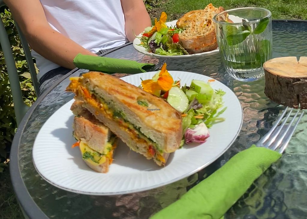 Serves meat, vegan options available. Teagarden in a big garden with greenhouse growing fresh produce. Serves coffee with oat or soy milk and lemonade. For vegan lunch there is pulled jackfruit, a vegan burger, soup, and a quinoa bowl. Open Wed-Sun 10:00-18:00.