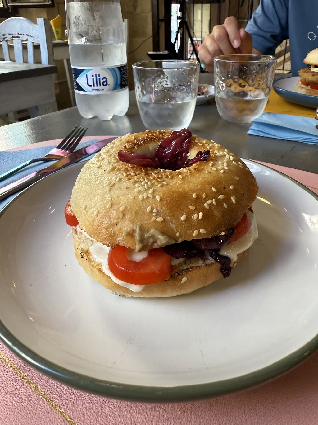 Bagel artigianale con hummus al curry,Chips di carote,falafel,insalata…