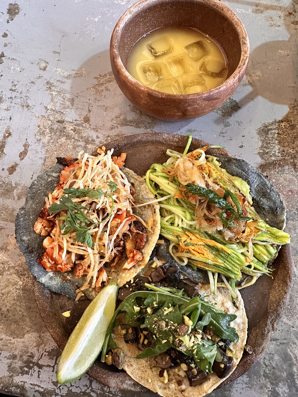 We tried the 3 different vegan taco options (pumpkin flower, cauliflower al pastor, hummus) and they all were very tasty. Price is somewhat expensive for Mexico (45$ per taco).